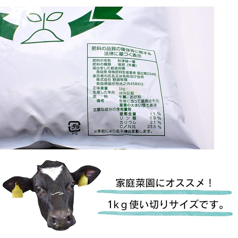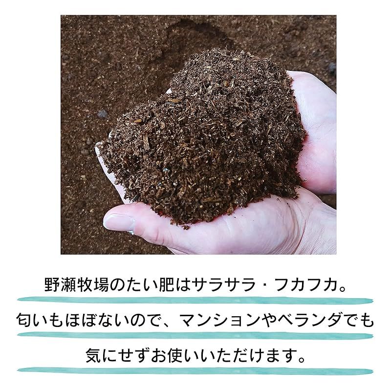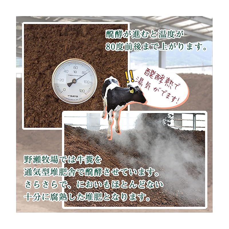 牛糞醗酵堆肥とは牛の糞を発酵させた有機肥料です。 少量の使い切りサイズは置き場所に困りません。 小さなプランターや、ガーデニングにも使いやすいです! 作物や花を育てるための土壌を作るために使用され、 土壌を改良することで、野菜や果物を美味しく、植物をきれいに栽培することができます。 排水性、通気性を良くし保水力を高めるので水や空気が通りやすくなり ふかふかの土へと改良していきます。 野瀬牧場では牛糞におがくずを混ぜ、発酵させています。 ほとんど匂いもなく、さらさらしているので使いやすい堆肥です。 造園業や果物農家・野菜農家の方から好評でリピートされています。 匂いがほぼないので、家庭菜園やベランダでのプランターでのご使用もおすすめです! 薔薇などの植物にご使用されるかたもおられます。 成分表をご覧になり、育成されている作物や植物に合わせてご利用ください。 入れすぎますと成分過多となりますのでご注意ください。