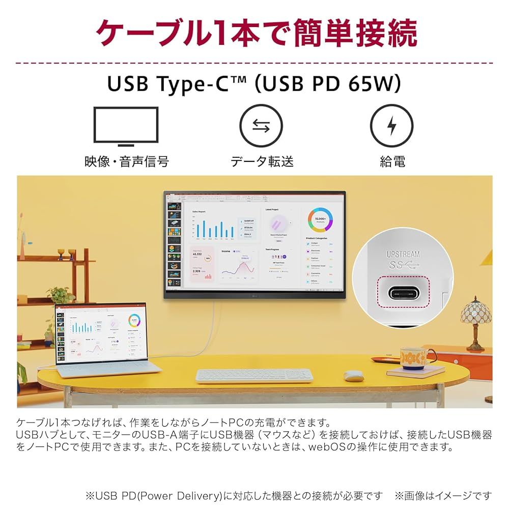 USB Type-C仕様:映像入力(DisplayPort Alt Mode)、給電(USB PD 65W)、データ転送