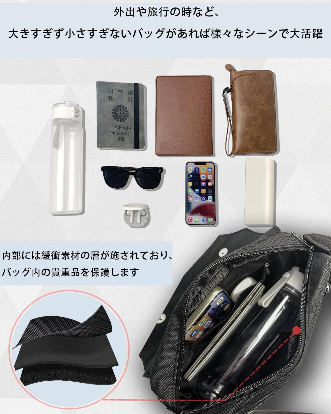 【洗練されたファッション性と実用性】本製品は、斬新で先進的なデザインを備えたショルダーバッグです。流行を捉えたスタイリッシュな外観とともに、細部にまで行き届いたこだわりが随所に感じられます。調節可能なバックルを搭載し、お好みに合わせて自由なサイズ調整を実現。装着方法も多彩で、ボディバッグ、ショルダーバッグ、メッセンジャーバッグなど、様々なスタイルに対応いたします。シンプルなデザインは、性別や年齢を問わず幅広い層にお使いいただけます。その機能性は極めて高く、ショッピング、アウトドア、スポーツ、ゴルフ、ウォーキング、サイクリング、旅行、フィッシング、登山など、多岐にわたるシーンで活躍いたします。