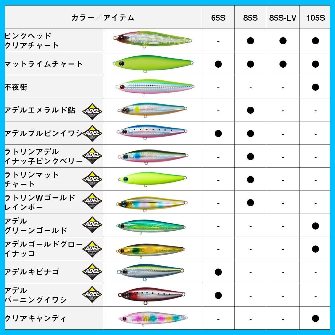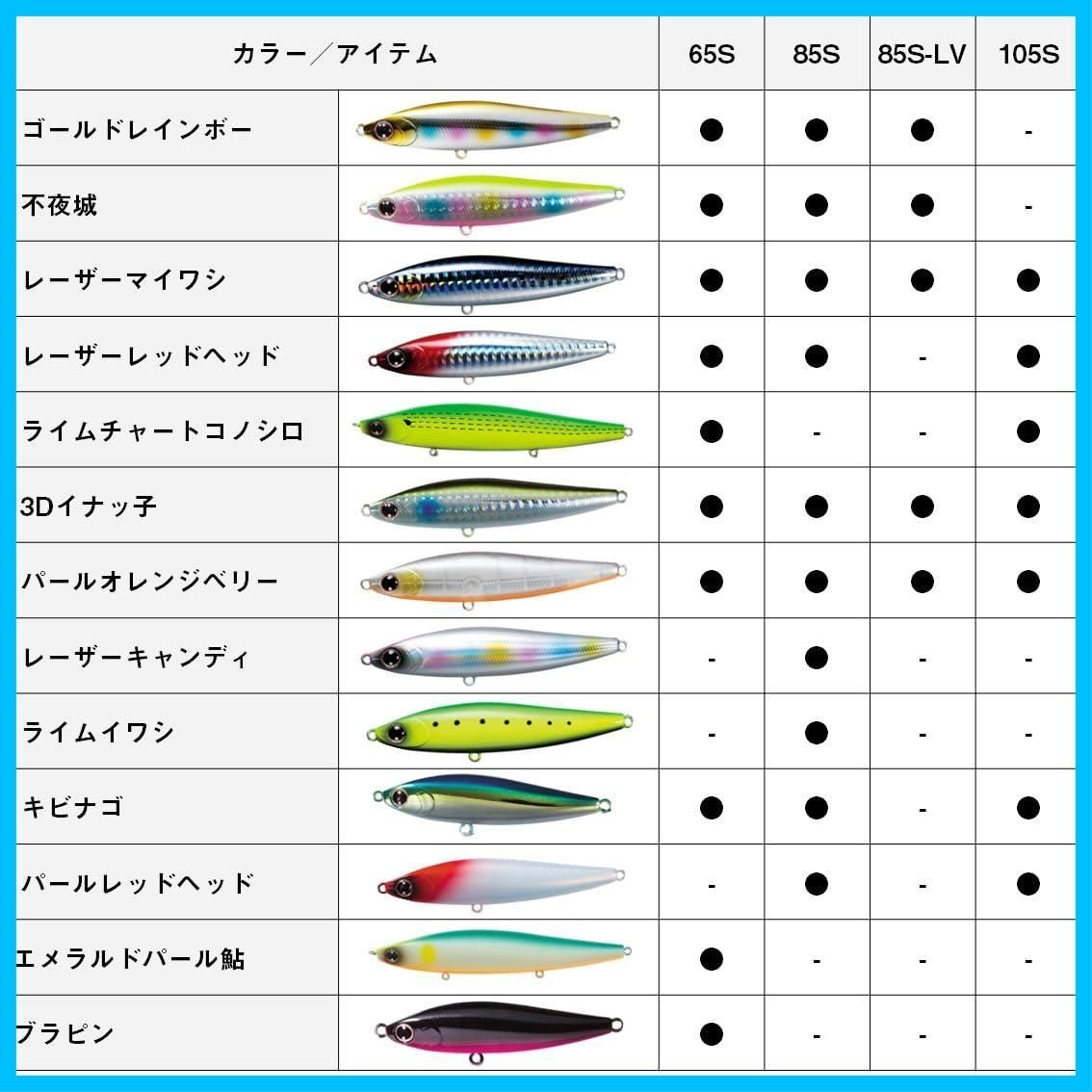ダイワモアザン スイッチヒッター 105Sタイプ:スローシンキングサイズmm):105標準自重g):21.2有効レンジcm):約2080アクション:ワイドスラローム飛距離m):最大 77.0/平均 74.0フック仕様:トレブル #4トレブル/リング#3河川やサーフ・磯・干潟などのシャローエリアや水面直下を簡単に攻略できるデイ&ナイト対応シンキング&スイミングペンシル。ジグ並みに飛距離が出るので、ミノーでは届かない遠くのボイルも射程範囲に収める。コノシロ・落ち鮎・イワシ・イナッコ・ハタハタ等様々なパターンに対応。アクションは流れに敏感かつ不規則なスラロームアクション。操作方法は、昼夜に関係なくスローリトリーブのタダ巻きのみ。プレッシャーが高い激戦区のフィールドで使用する時は、ダウンクロスではなくアップストリームキャストをオススメします。流されてくる小魚がシーバスの斜め前に現れるようなイメージでトレースさせるのがコツ。サーフ・磯・漁港・湾奥・都市型河川・河口・干潟・ボイル打ち・そしてピンチな時など、様々なフィールドでお試しいただきたい。