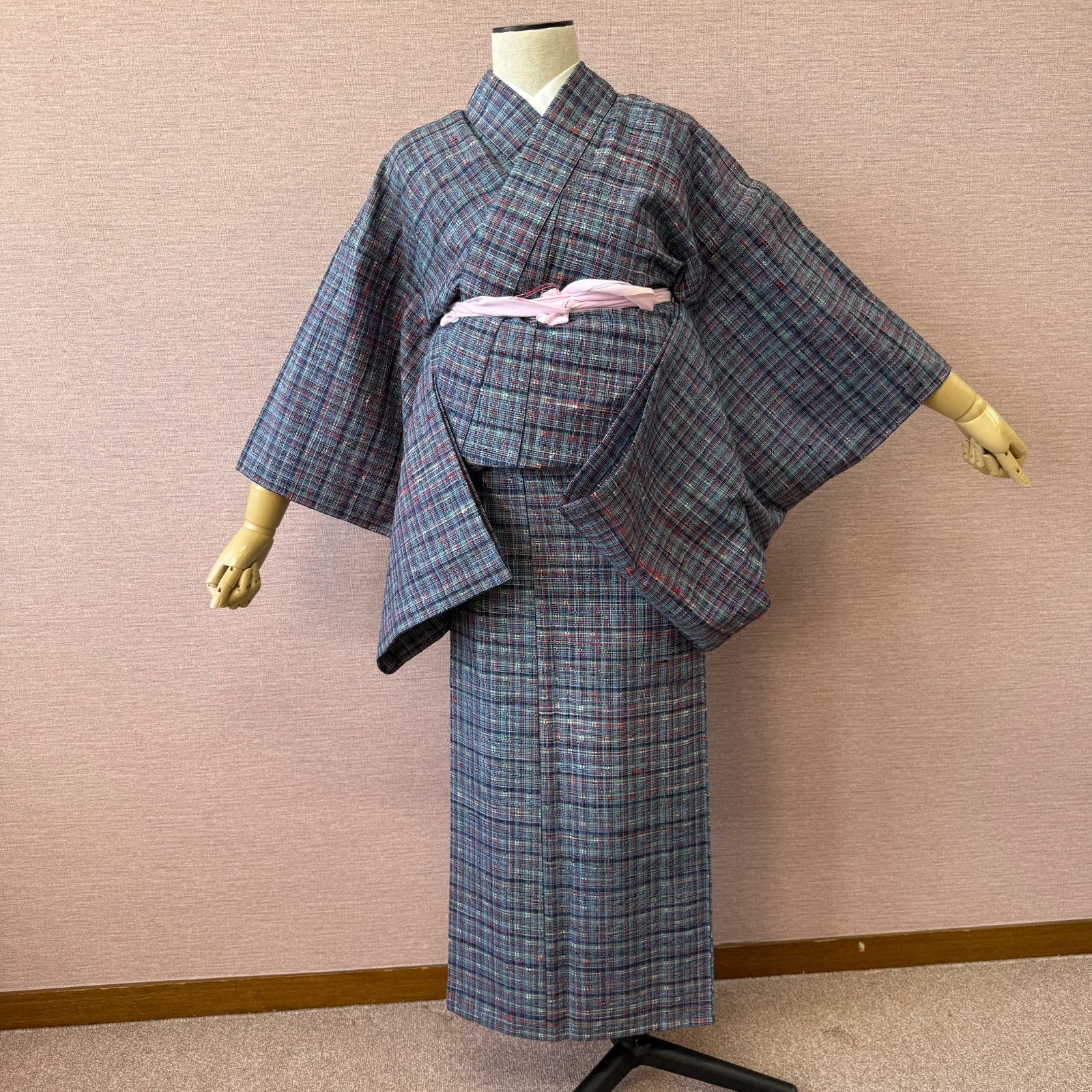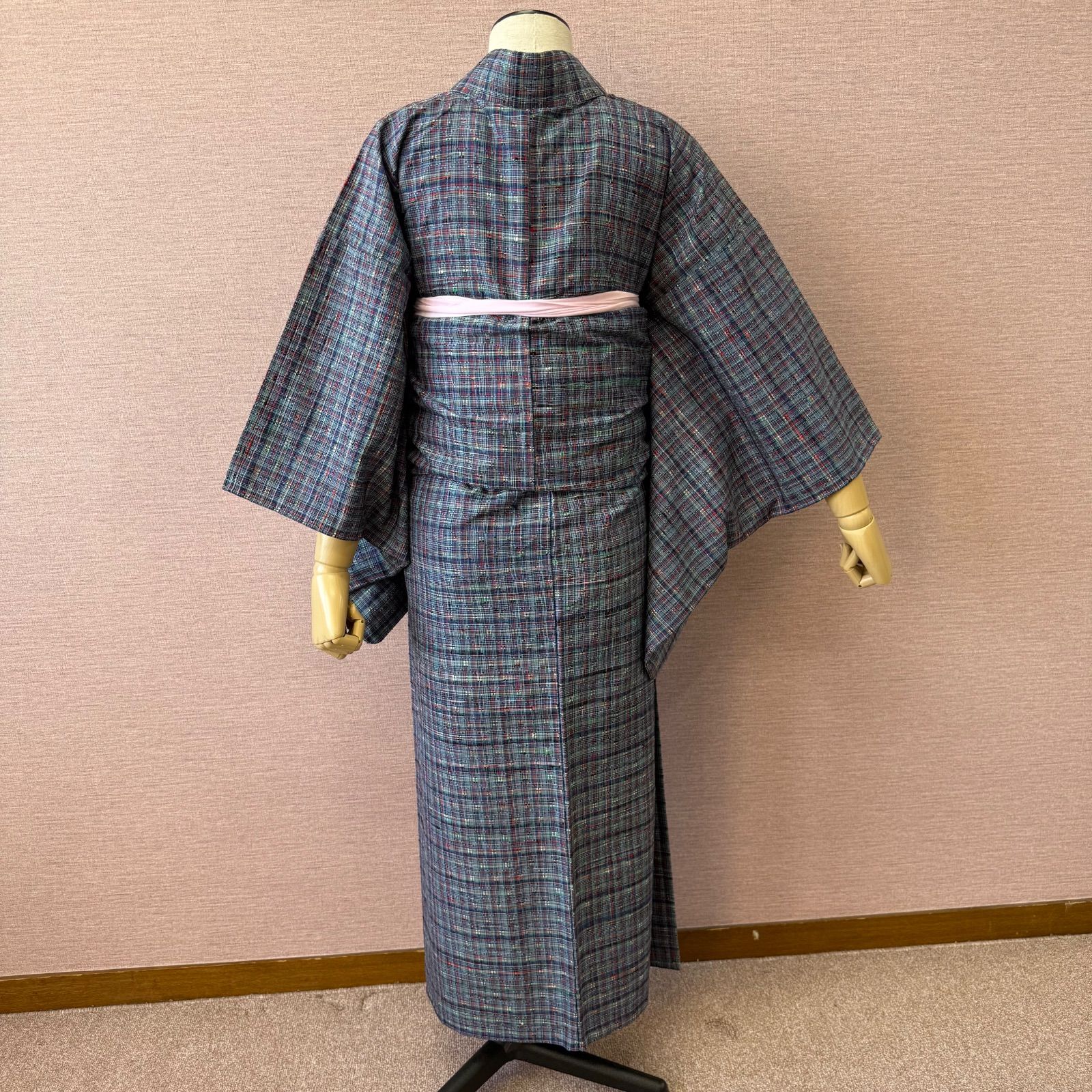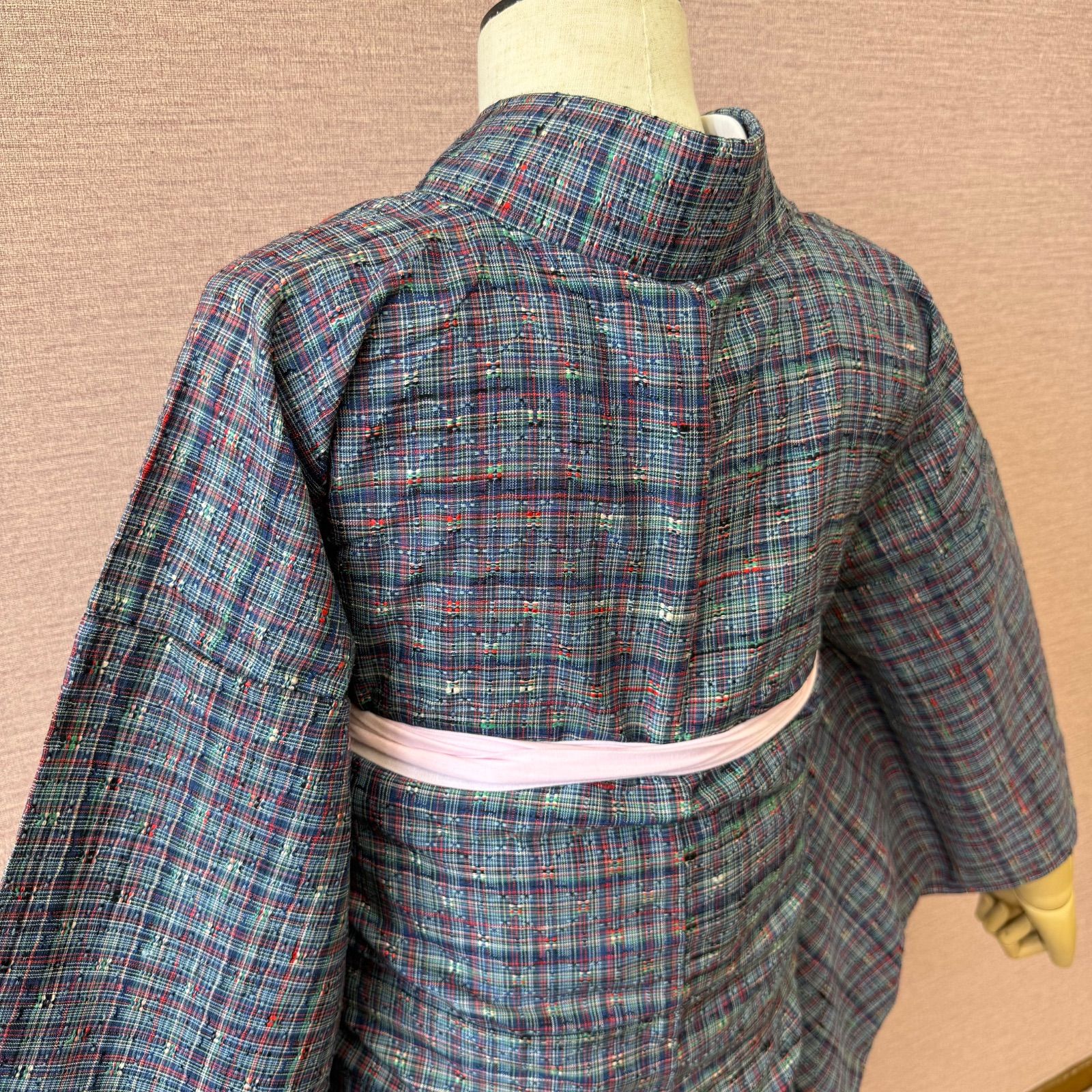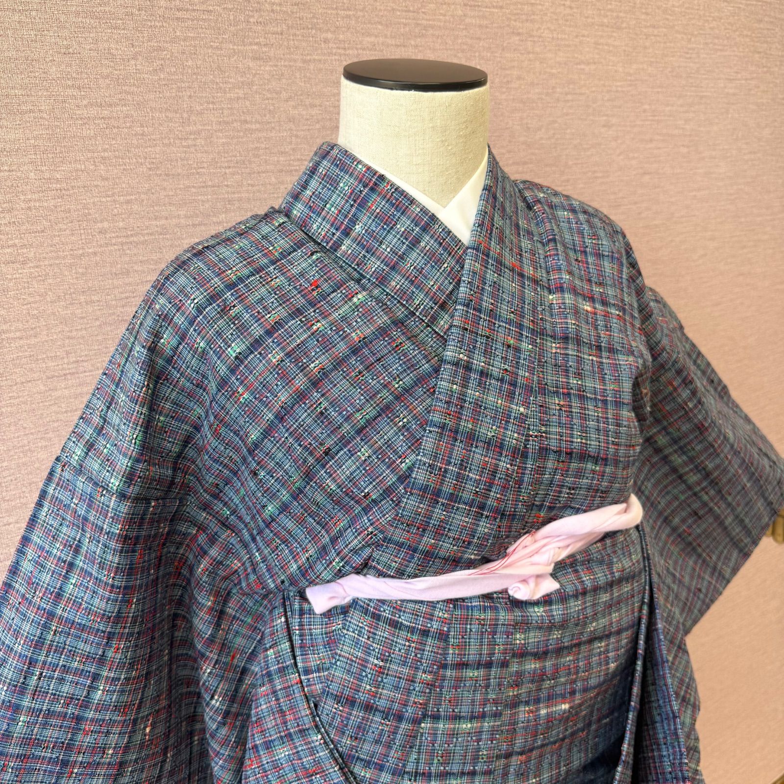 青地の格子がシンプルで色々な帯と合わせてコーディネートしていただけそうです。