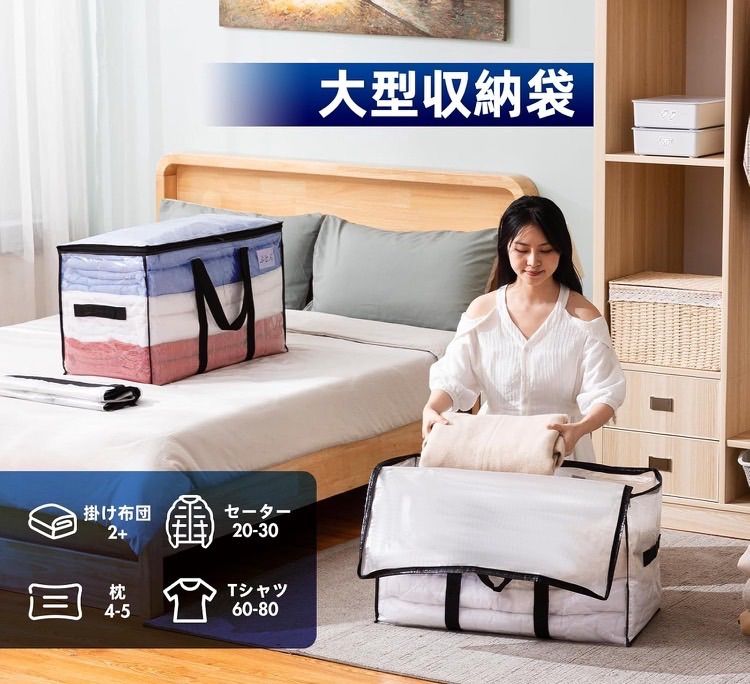 100L大容量、収納力抜群:抜群な特大引越しバッグの寸法:70 cm 35 cm 42 cm、2 パック。 両端のジッパーと中央に大きな開口部があるため、衣類、おもちゃ、靴、タオル、必需品、枕、寝具、シーツ、毛布、洗濯物、クリスマス飾りなどを簡単に収納できます