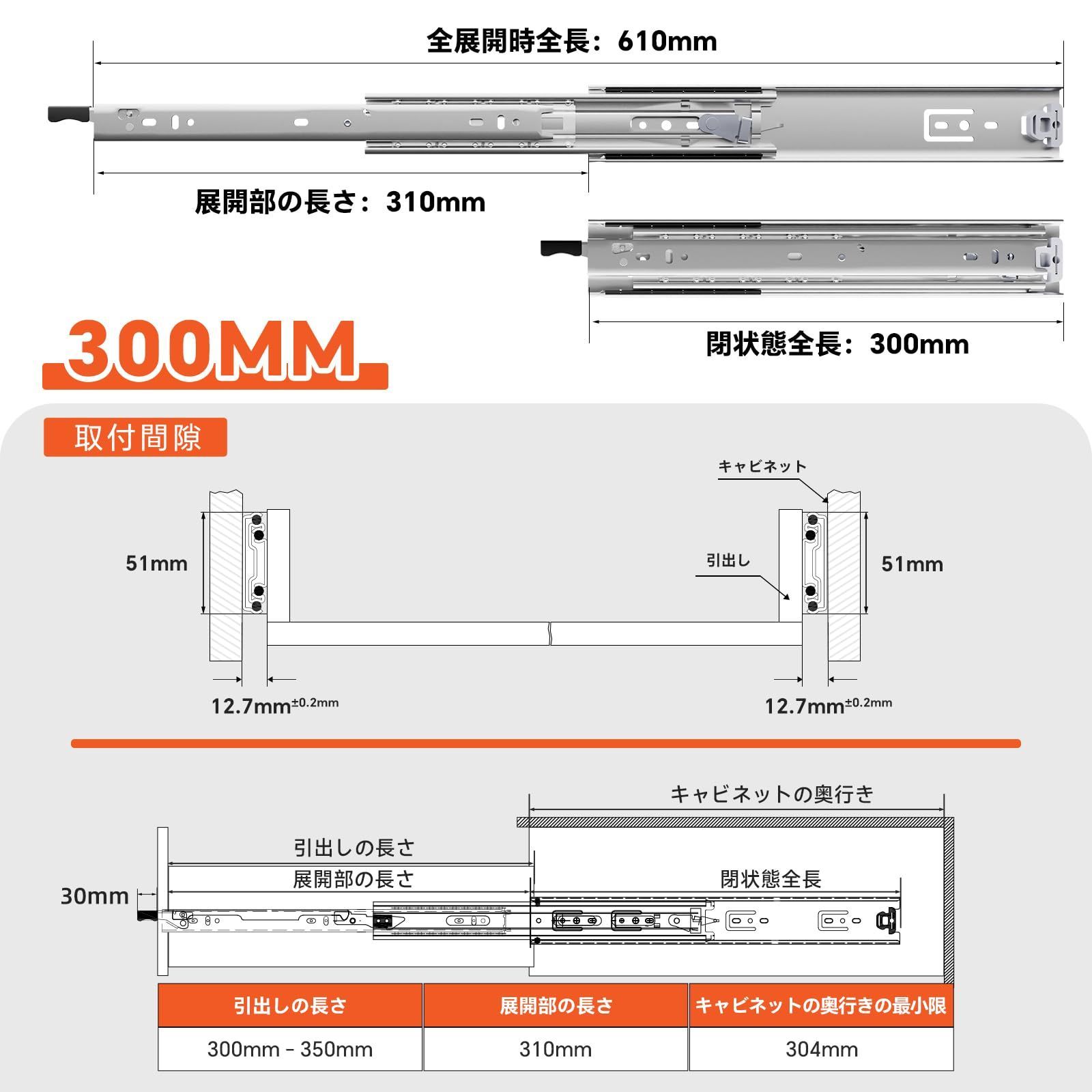 ToBeGreat 重量用 スライドレール 300MM ロック付き 幅51MM 3段 取り外し可能 Heavy Duty 引き出しレール 工業用 スライド レール キャラバン 棚 荷台用 サイドマウント 白い ネジ付き 2本入(ペア)