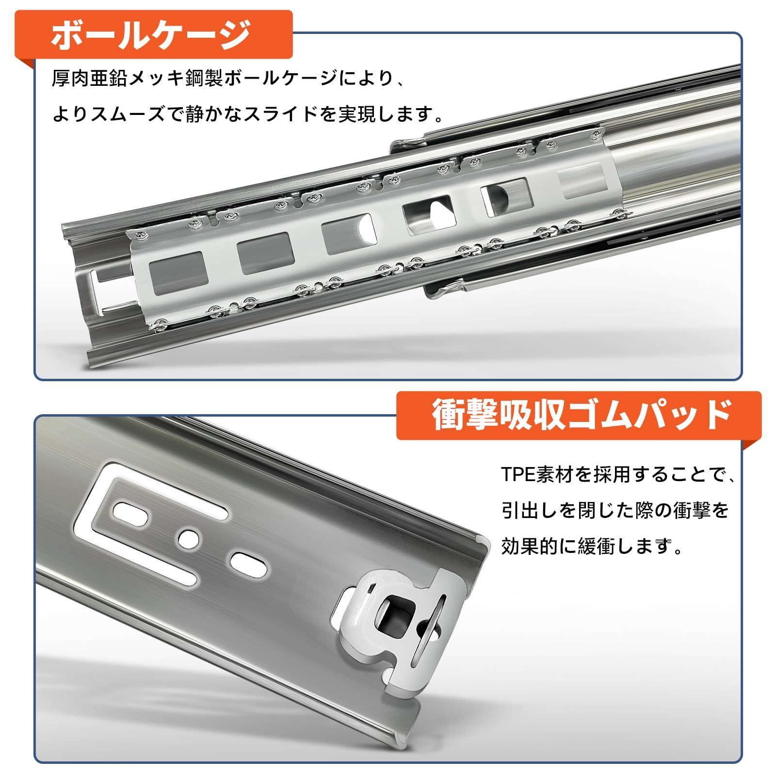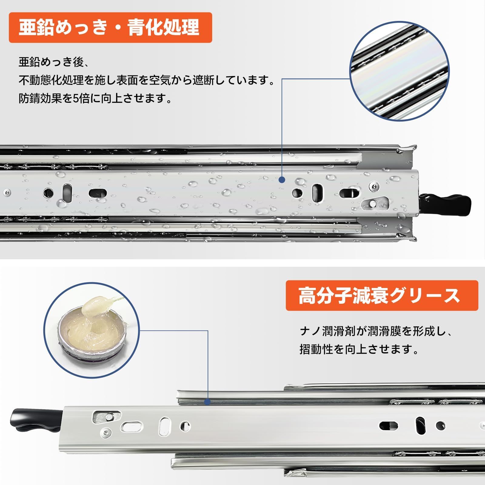 【スムーズな全拡張設計】3段全てが完全に引き出せるフルアウト設計 重量用 スライドレール です。収納スペースを無駄なく活用でき、奥に置いた物も簡単に取り出せます。ボールケージの滑らかな動きで、重い荷物を入れてもスムーズな開閉を実現します。