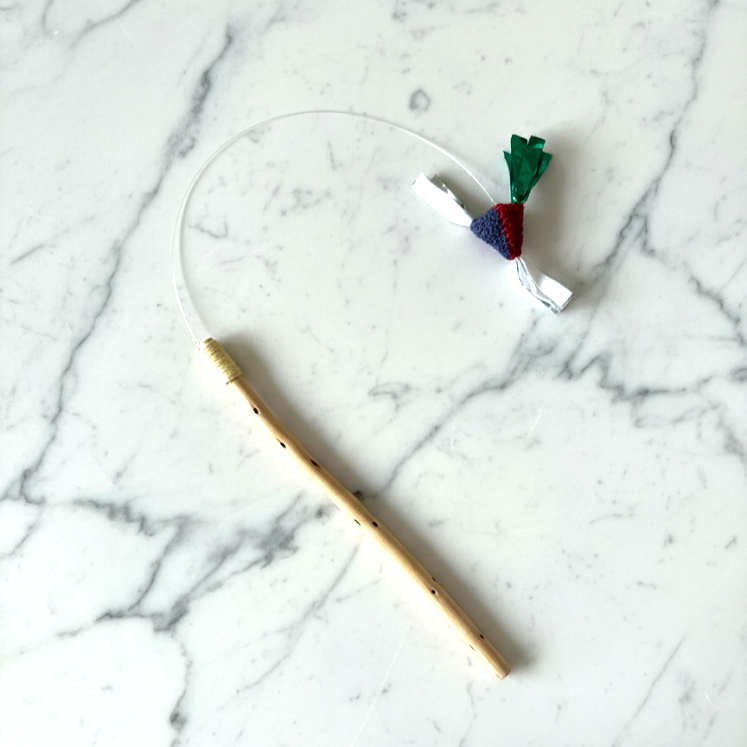 持ち手に天然流木を使用。先端の飾りは麻や木など、猫ちゃんにやさしい素材を厳選。