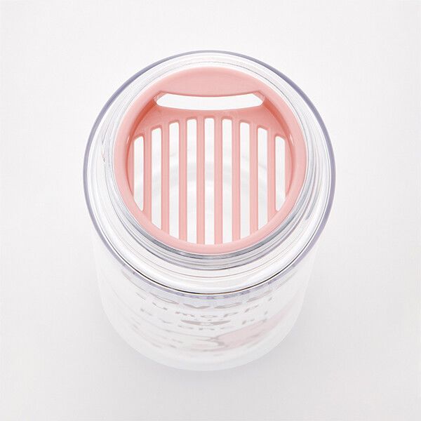 シンプルな形状の樹脂製ブローボトル(水筒)。冷たい飲み物用か常温用として使える。お茶やお水、ジュース等を入れて持ち運びできる。フルーツや野菜、ハーブなどを入れて簡単でおいしいフレーバーウォーターも作れる。液体だけが飲める、濾し器付きの飲み口。氷が入れやすい広口タイプ。フレーバーウォーターがすぐにできる簡単レシピ付き。電子レンジと食洗機は使用不可。