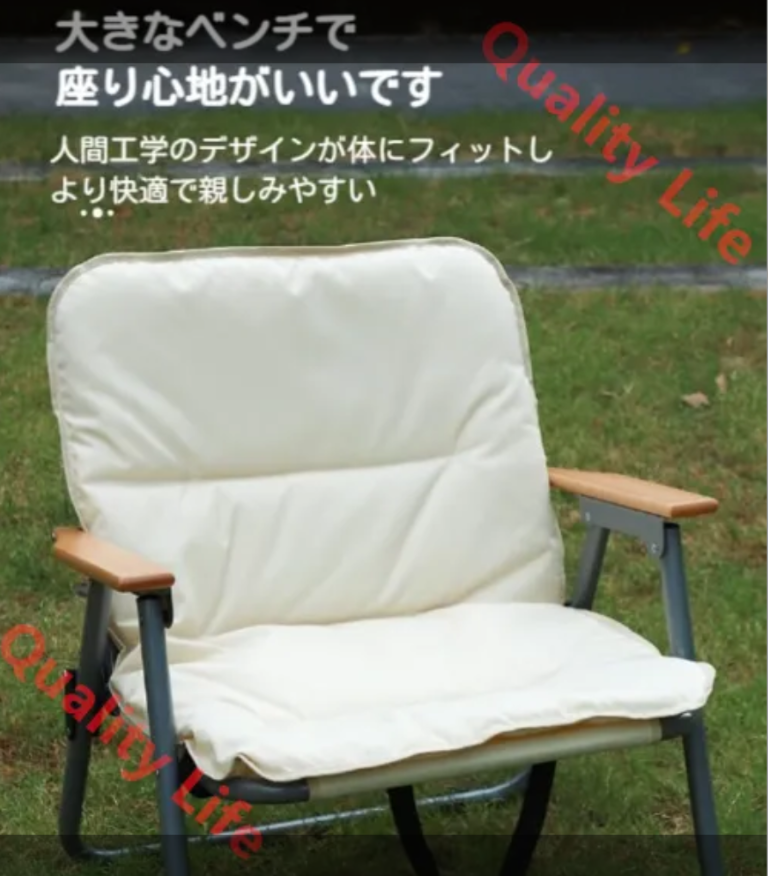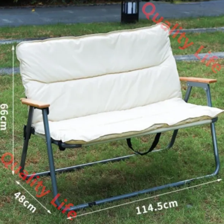 のベンチ椅子は、アウトドア用の折りたたみ式キャンプチェアです。木製で軽量で、クッション付きでアームレストを備えています。釣りやバーベキュー、キャンプなどのアウトドアシーンで活躍するポータブルなベンチで、ダブル折りたたみ式で、背もたれを持つソファチェアやラウンジチェアとしても使えます。カジュアルなデザインで、アウトドアでの快適な休憩を可能にします。