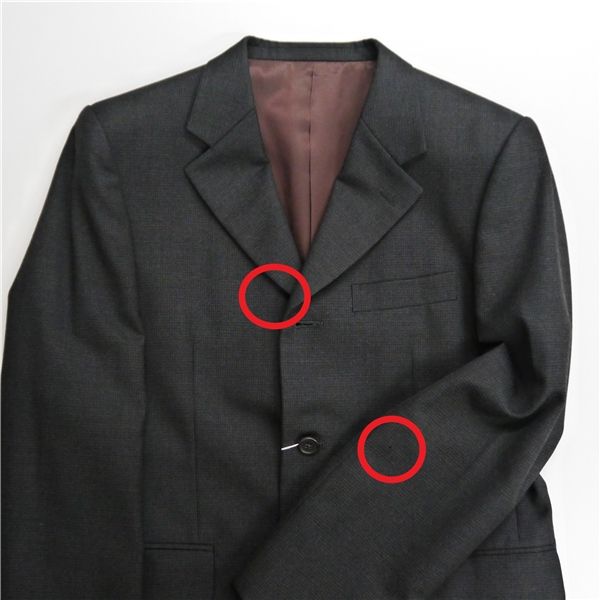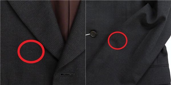 表地(全体的)状態:B(ジャケットの両袖にてかり・右胸と左肘付近およびベント右側に穴あきが見受けられます。その他の状態は良い事から、今後もまだまだご愛用頂けるお品だと思われます。)