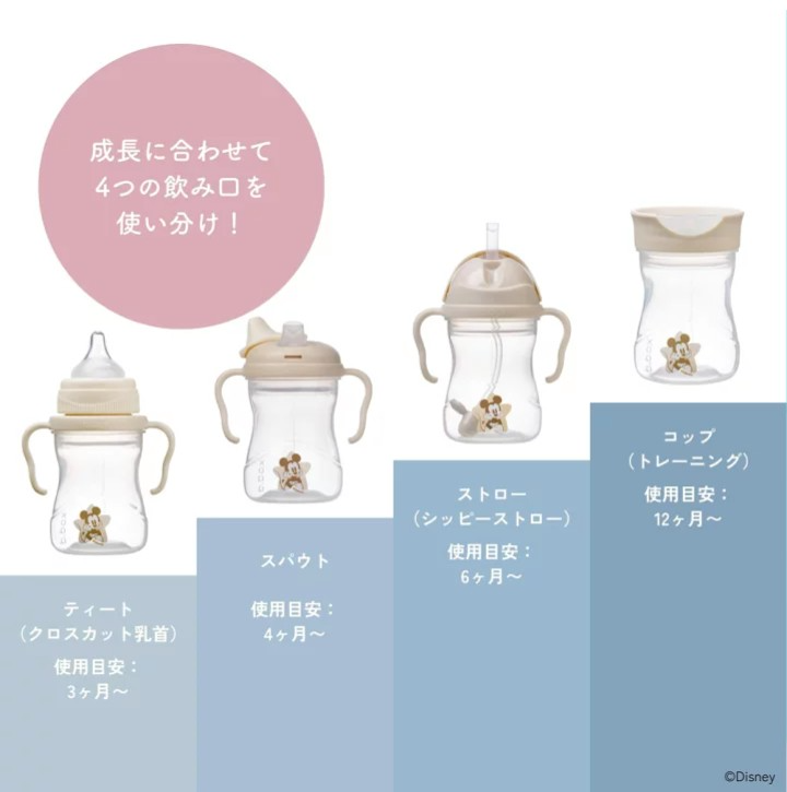 赤ちゃんの成長に合わせて蓋を交換するだけで, 4ヶ月- ら12ヶ月- 上赤ちゃんのドリンクトレーニングに対応できます