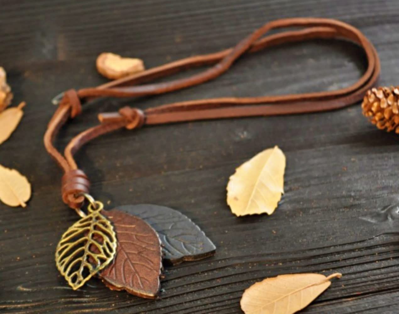 メタル、レザーを使ったカジュアルな木の葉モチーフペンダントのご紹介です。(ダークブラウン)