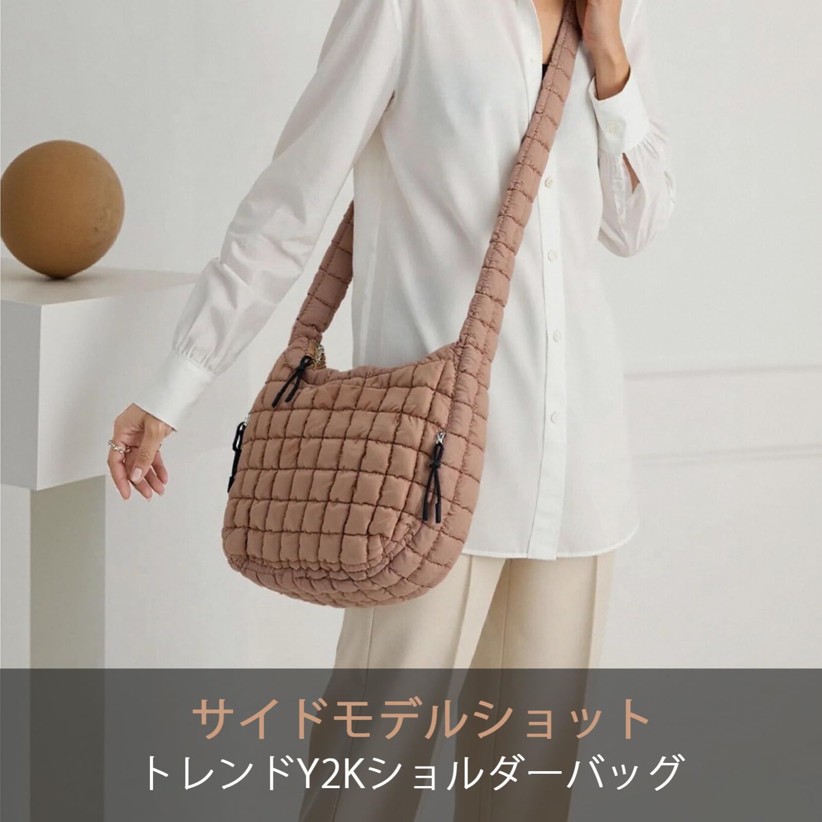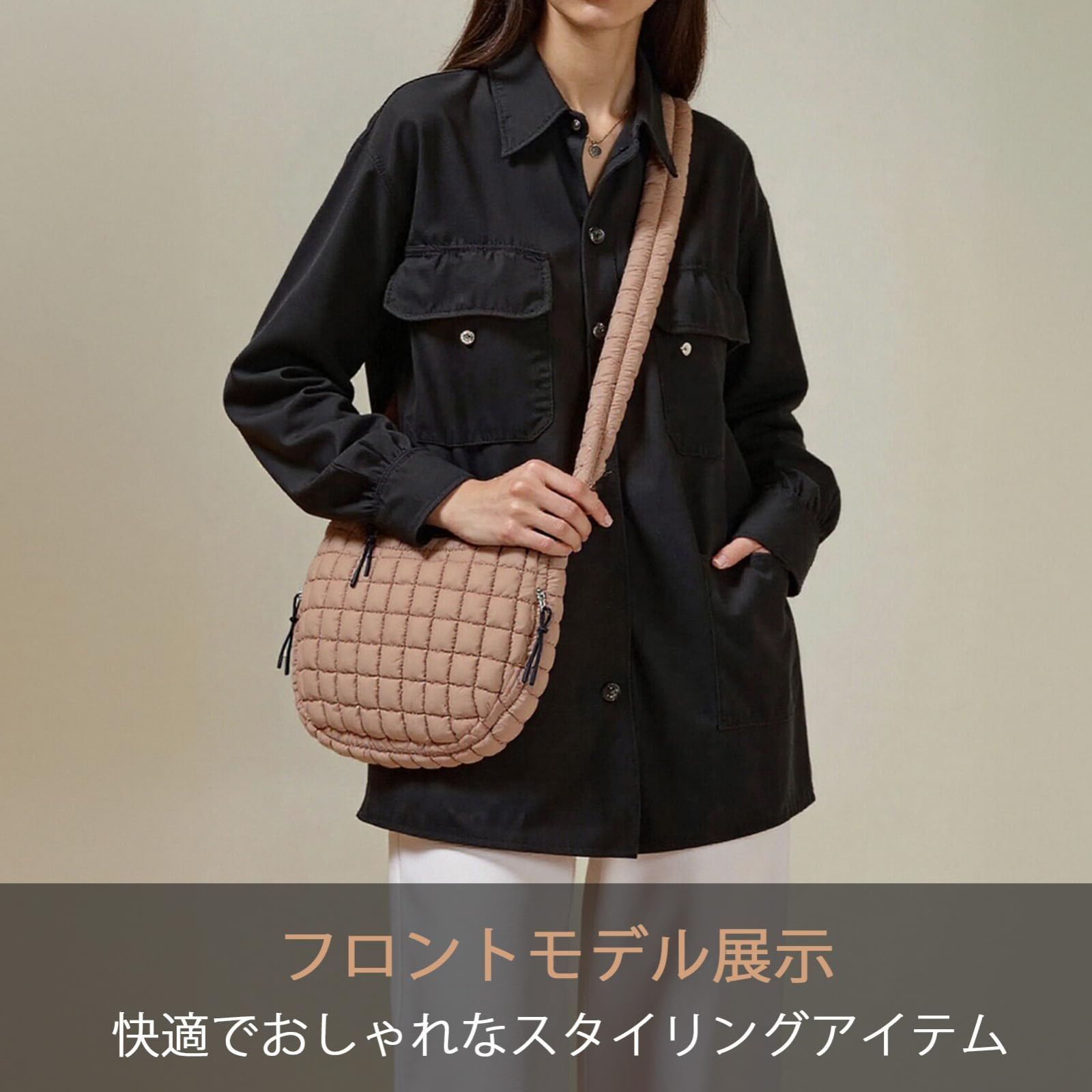 【雲のようなキルティングで柔らかく抱き心地の良い見た目】ふんわりとしたキルティングバッグ(ポップコーン風の格子キルティング)は見た目にも触り心地にも“やわらかさ”があり、まるで雲を抱いているような愛らしさ。三日月を思わせる丸みのあるハーフムーンバッグフォルムが、カジュアルな中にも洗練された印象を与え、おしゃれでかわいいルックスが一目で目を引きます。