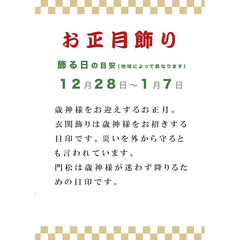 新しい年を幸福で実り大きい年でありますよう、心を込めて作り上げました。お正月飾りは古い不浄を払い、一年間家族を守って頂ける[年神様(歳神様)]を迎える為の物であり、また、家内安全・交通安全・商売繁盛を祈願する意味も込められています。本来は、松の内がすぎましたら燃やすのが習わしですが、環境問題等の配慮からお住いの各地方自治体の指示に従って処分してください。