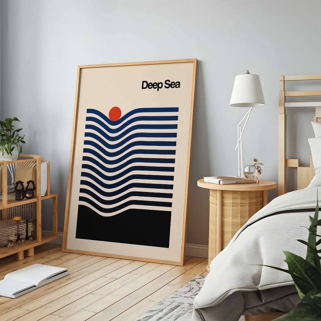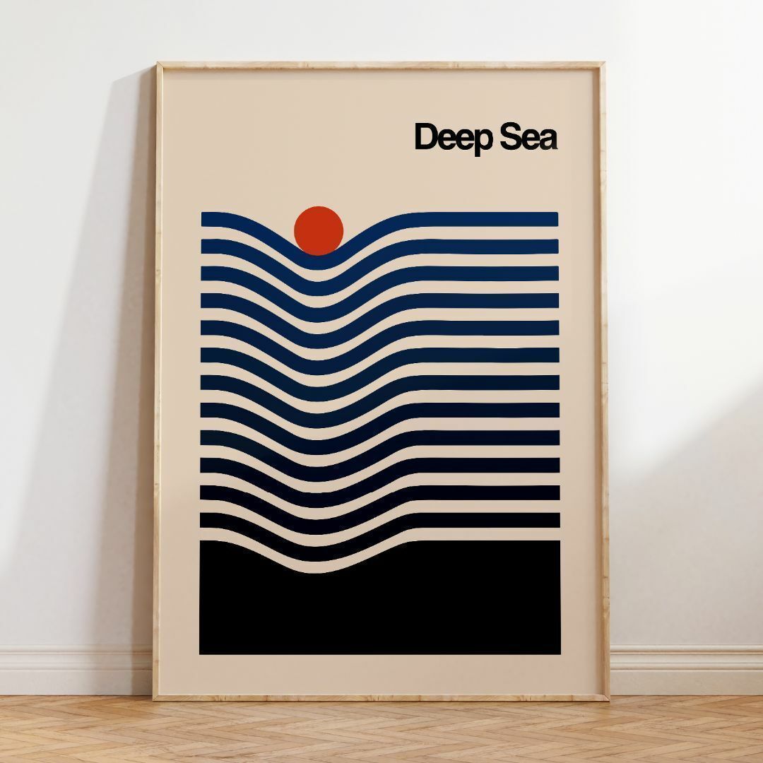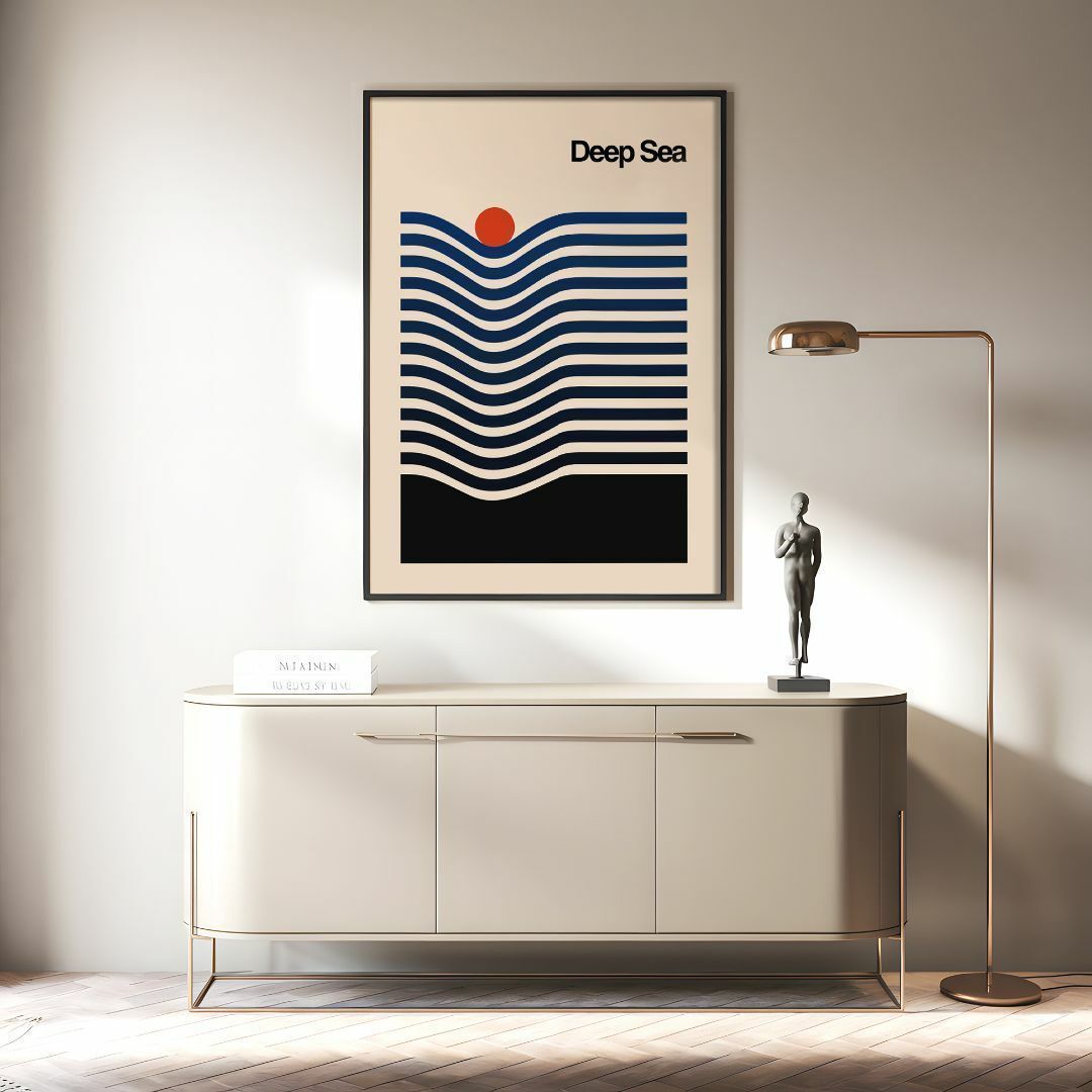 深い青と黒の波模様に、赤い太陽がアクセントとなったモダンな抽象アートポスターです。シンプルながらも存在感があり、リビングやオフィス、カフェなど幅広い空間におすすめ。お部屋に洗練された雰囲気と落ち着きをもたらします。現代的なインテリアや北欧風のお部屋にもぴったりです。