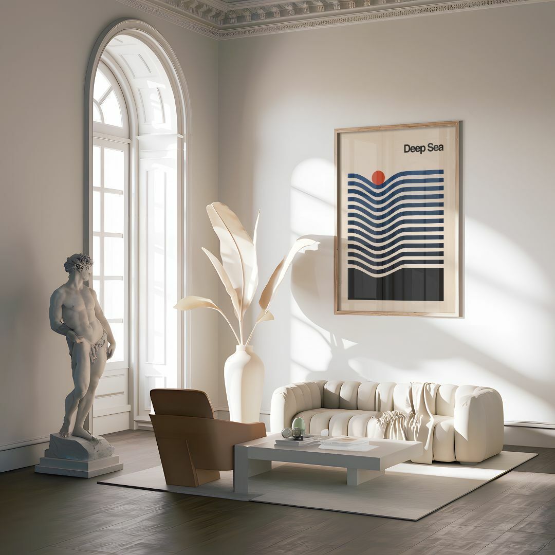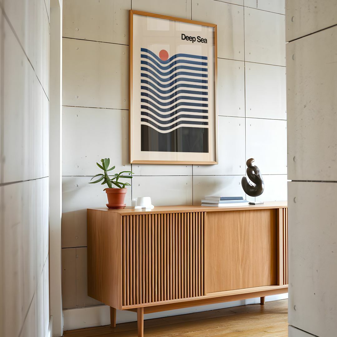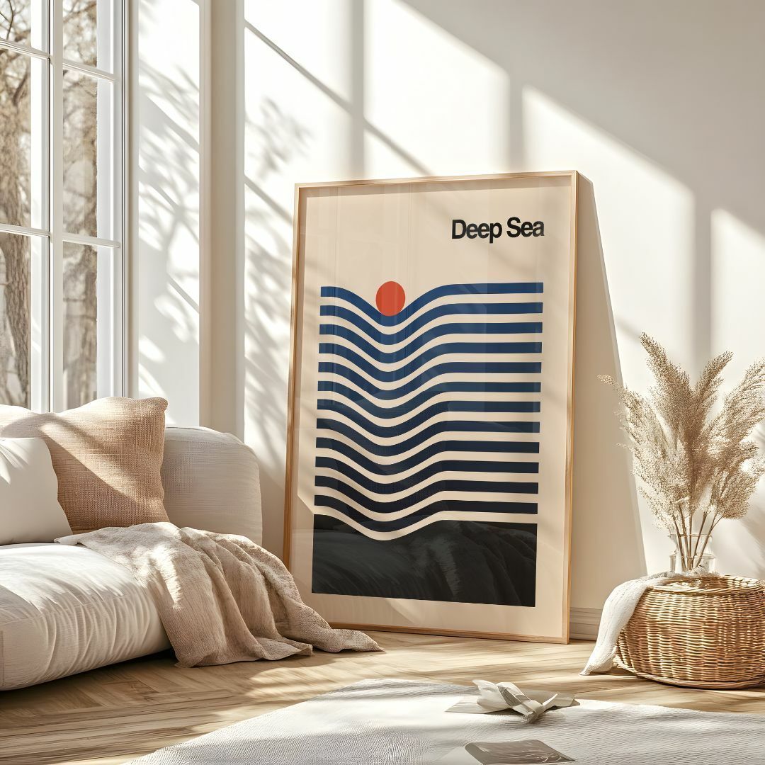 深い青と黒の波模様に、赤い太陽がアクセントとなったモダンな抽象アートポスターです。シンプルながらも存在感があり、リビングやオフィス、カフェなど幅広い空間におすすめ。お部屋に洗練された雰囲気と落ち着きをもたらします。現代的なインテリアや北欧風のお部屋にもぴったりです。
