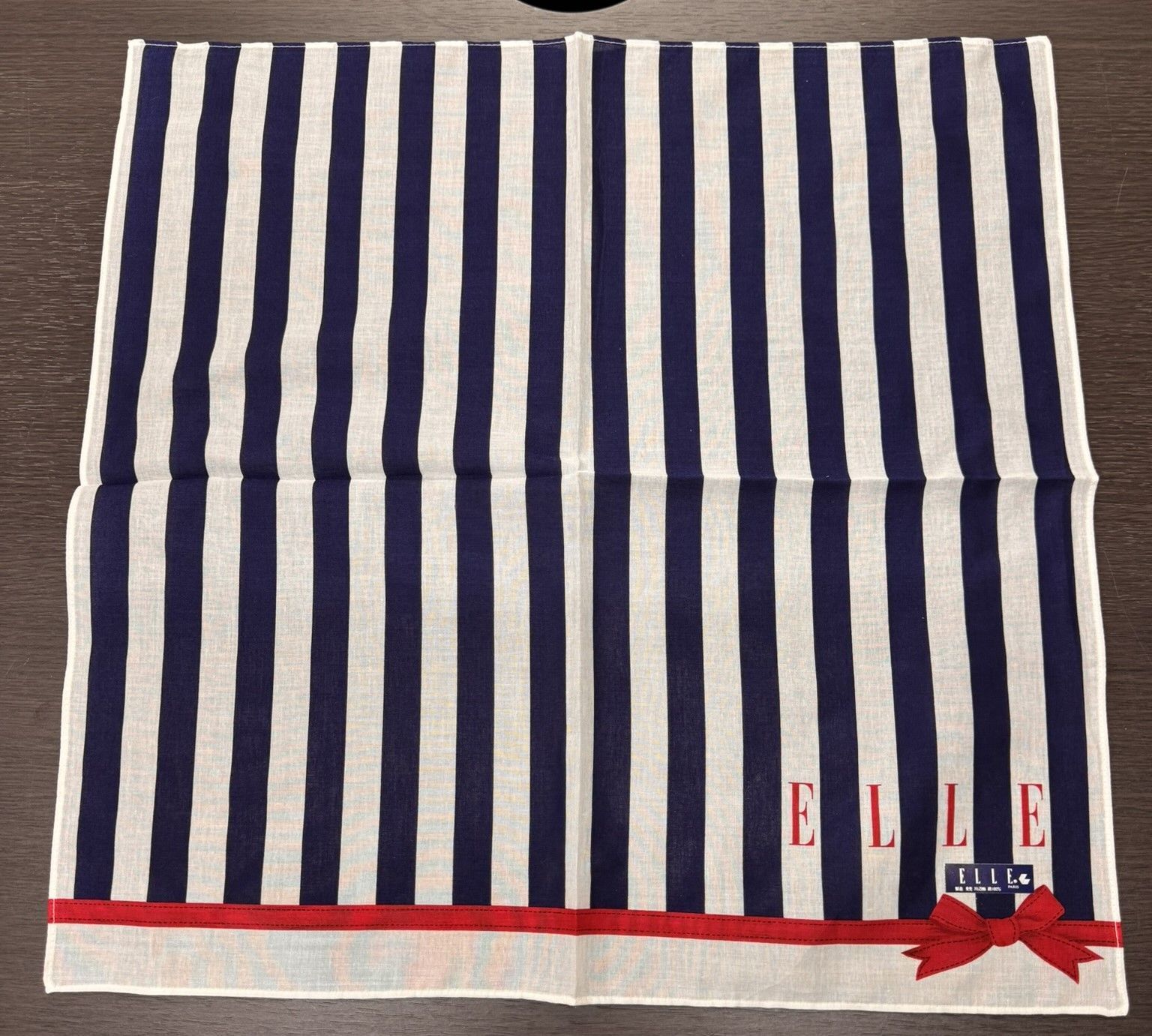2枚は紺・白のストライプ柄に赤でリボンとブランドのロゴがデザインされています。