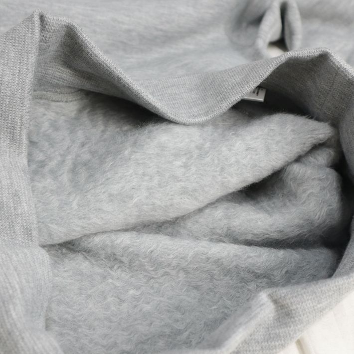 生地はアクリル、ナイロン、ウールの混紡素材で、天然繊維100%の生地よりも軽く、バルキーな生地に仕上がっています。