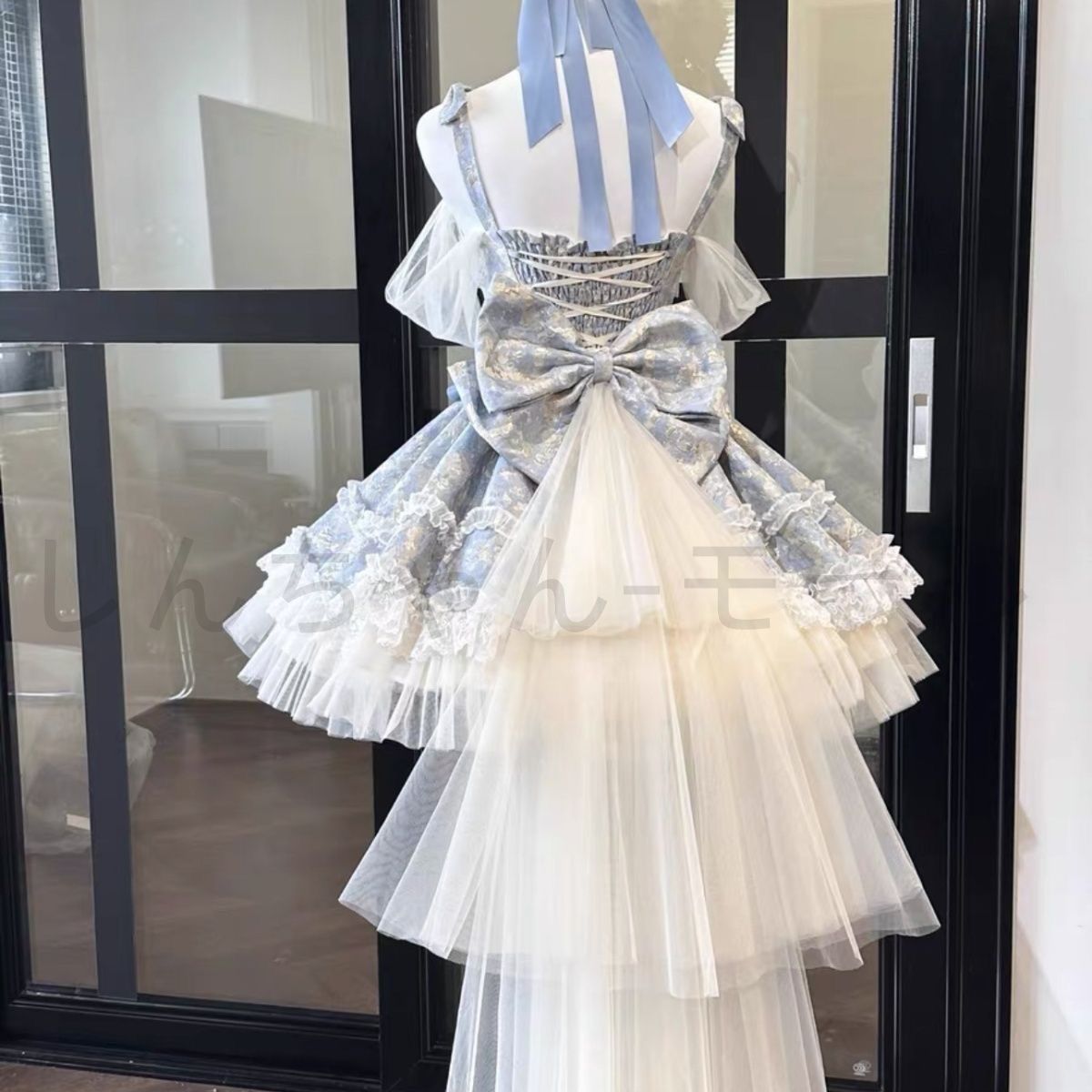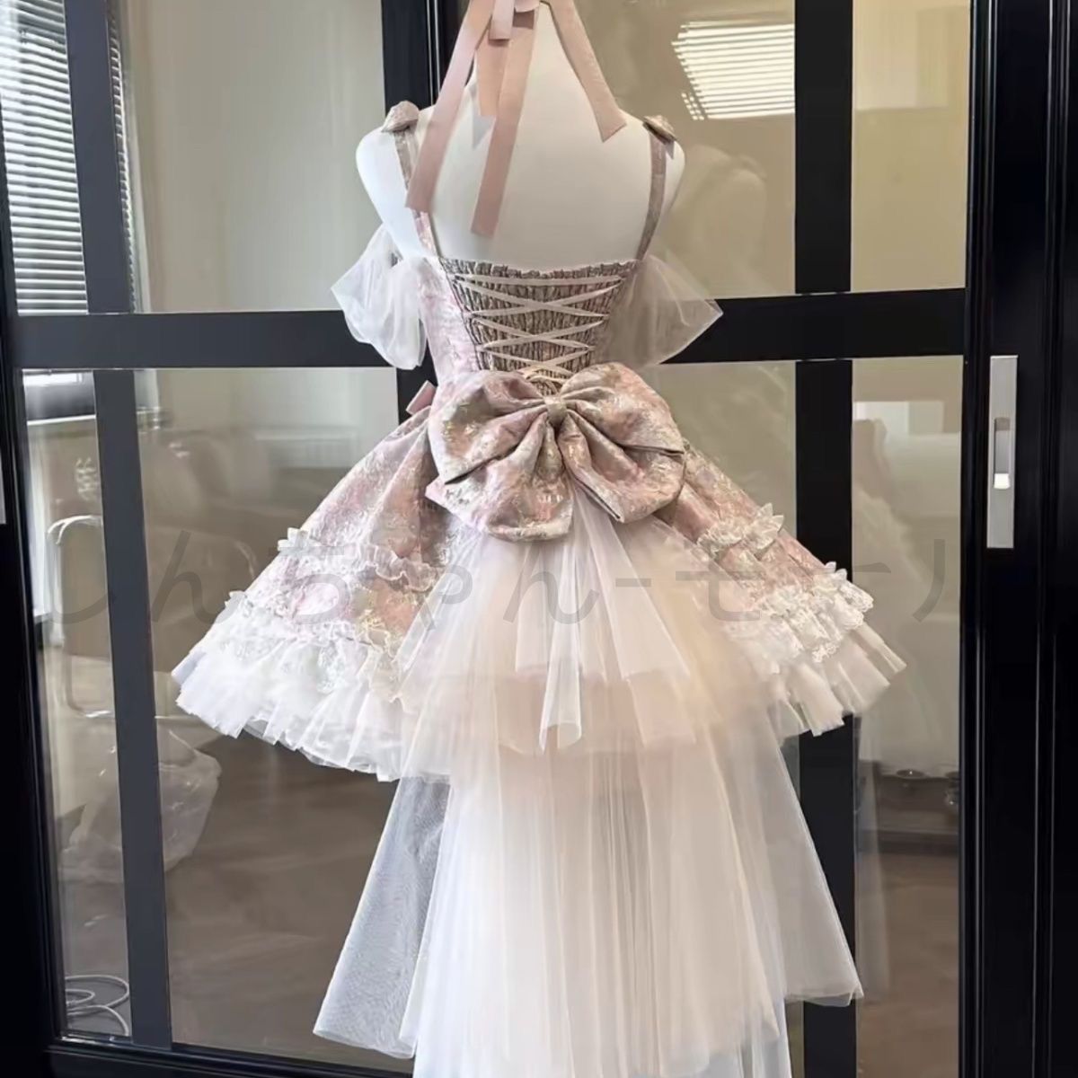 デザイン:フリル付きのフェミニンなプリンセススタイルで、後ろに大きな蝶結び装飾を採用。