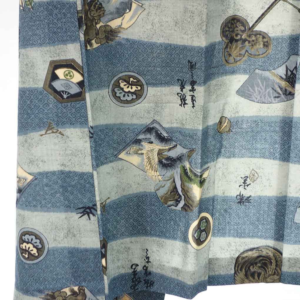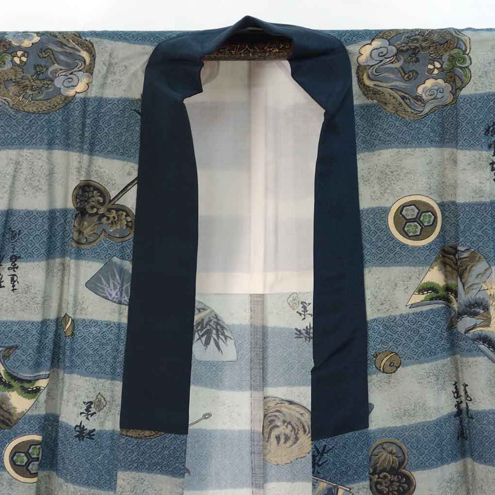 紳士物の胴抜袖無双仕立のモス長襦袢です。グレーとブルーの横段柄で、主にカジュアル用途ですが半衿を白にすれば紋付にも合わせお使いいただけます。身長170cm以上の方にお勧めサイズです。襟が裾まで伸びている関東襟仕立です。裄の縫い代は2cm程度ありそうです。