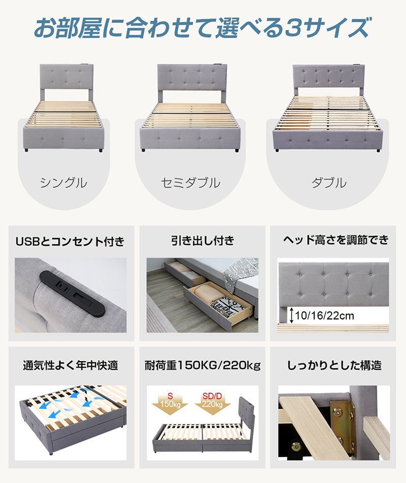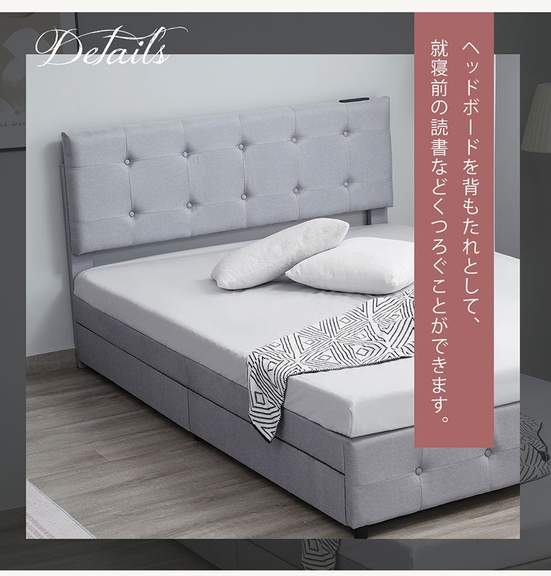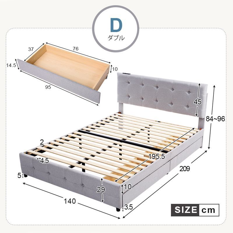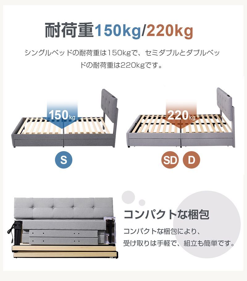 ベッドフレーム ダブルベッド すのこベッド ベットフレーム 収納 チェストベッド コンセント 引き出し付き ローベッド ファブリック 頑丈 家族用