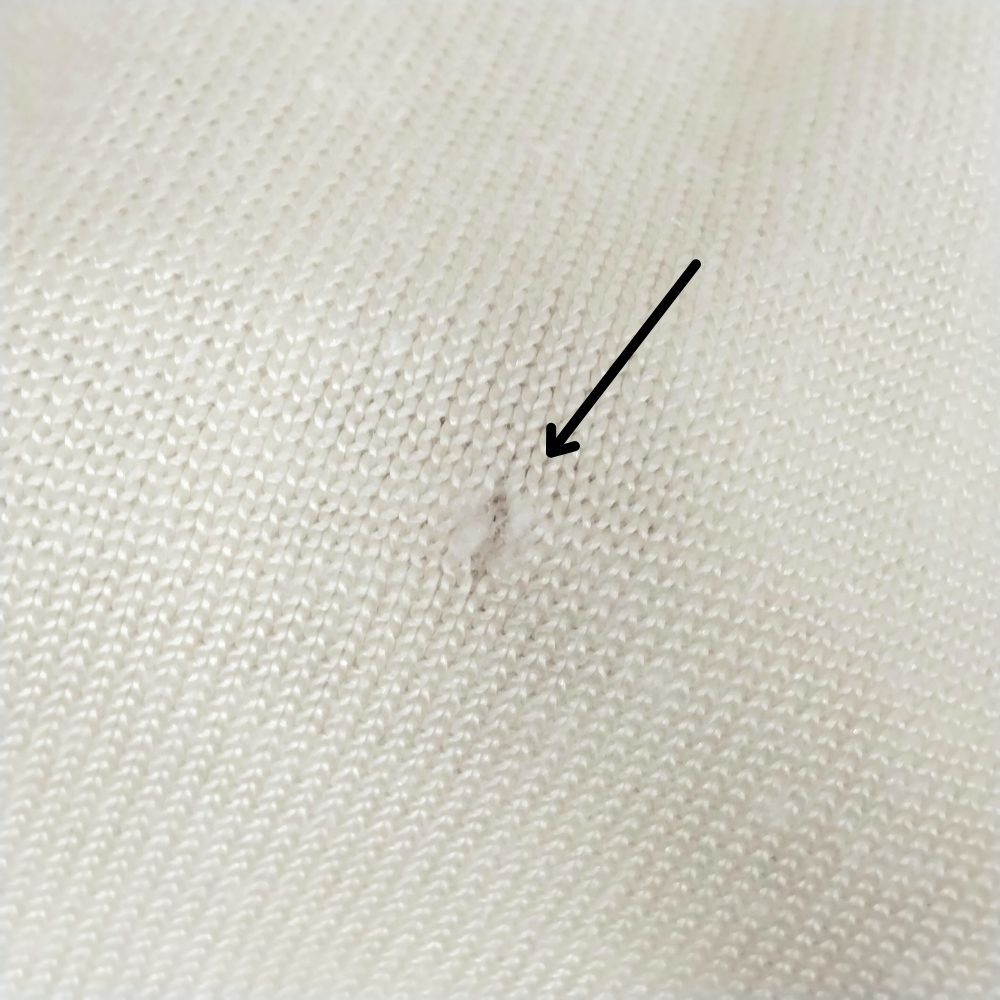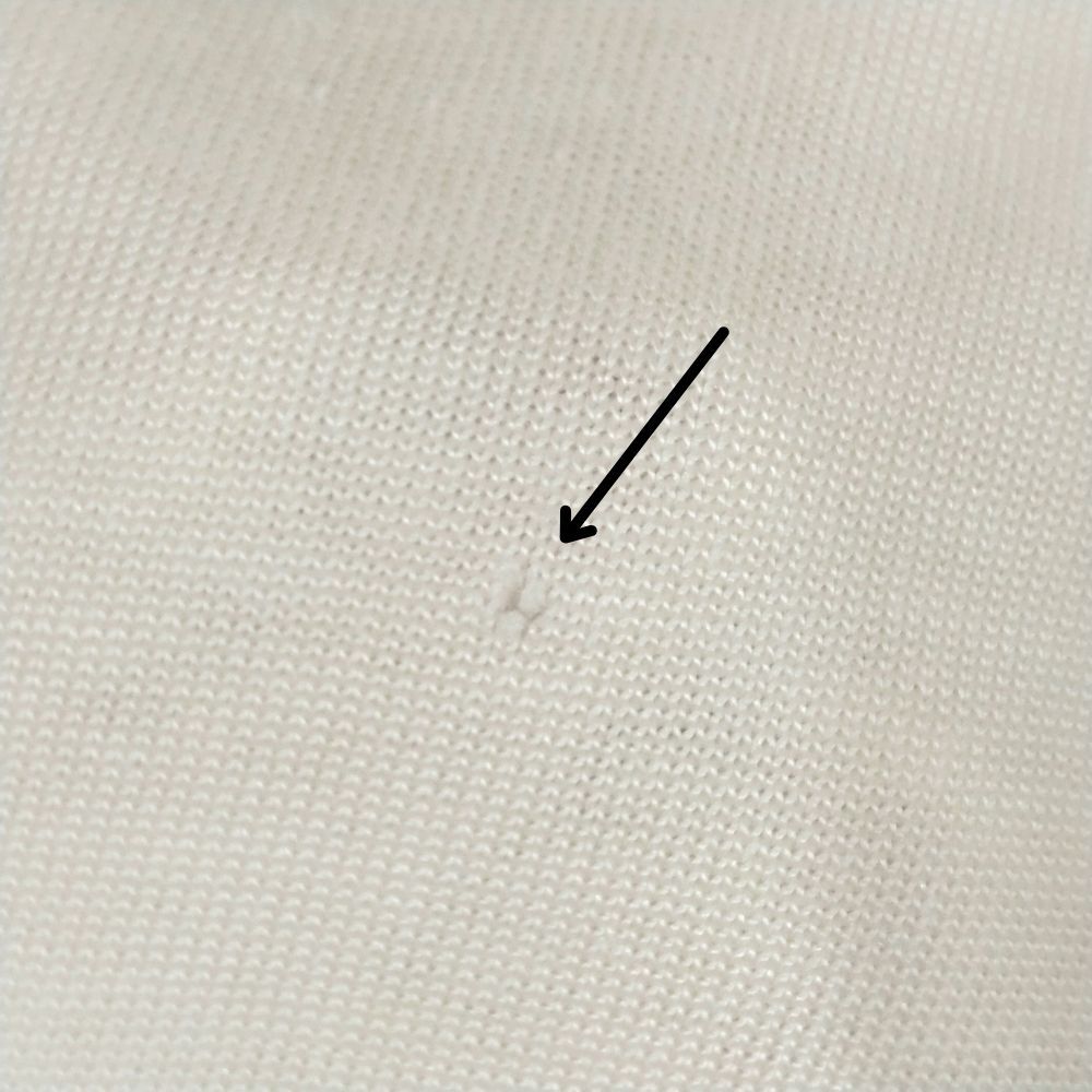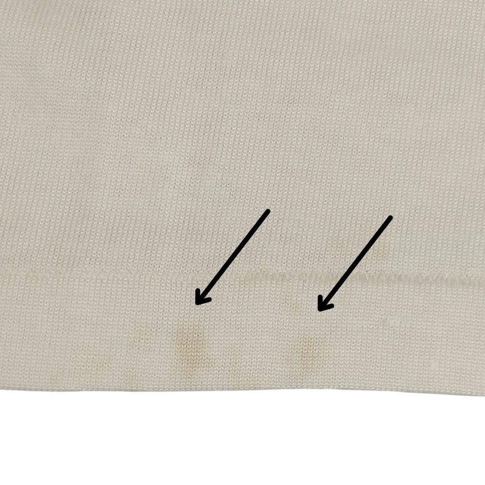 ユーズド品で多少の着用感あり、前プリント下辺り、背面中央辺りに小さい穴あり、生地に多少の毛羽立ちあり、後ろ裾と襟に汚れがあります。