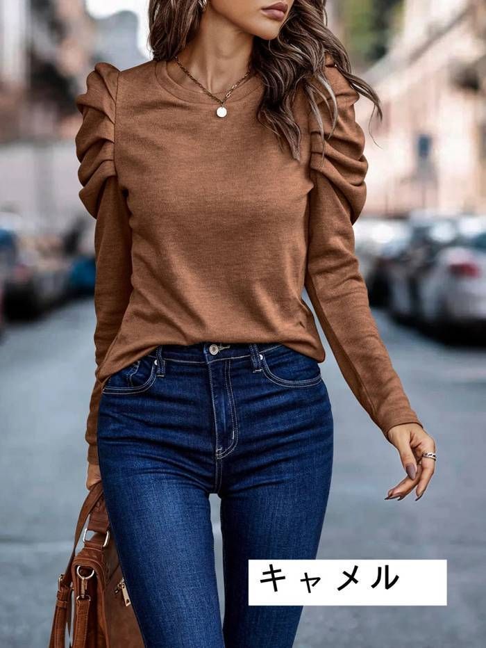 カットソー 長袖 未使用 レディース ストレッチ Tシャツ バルーンスリーブ クルーネック 春 秋 冬 トップス お洒落 シンプル プルオーバー