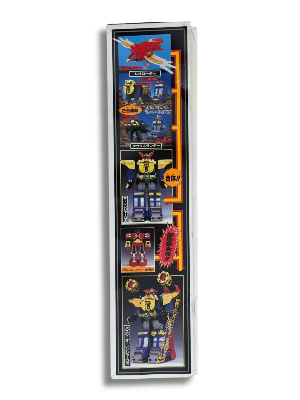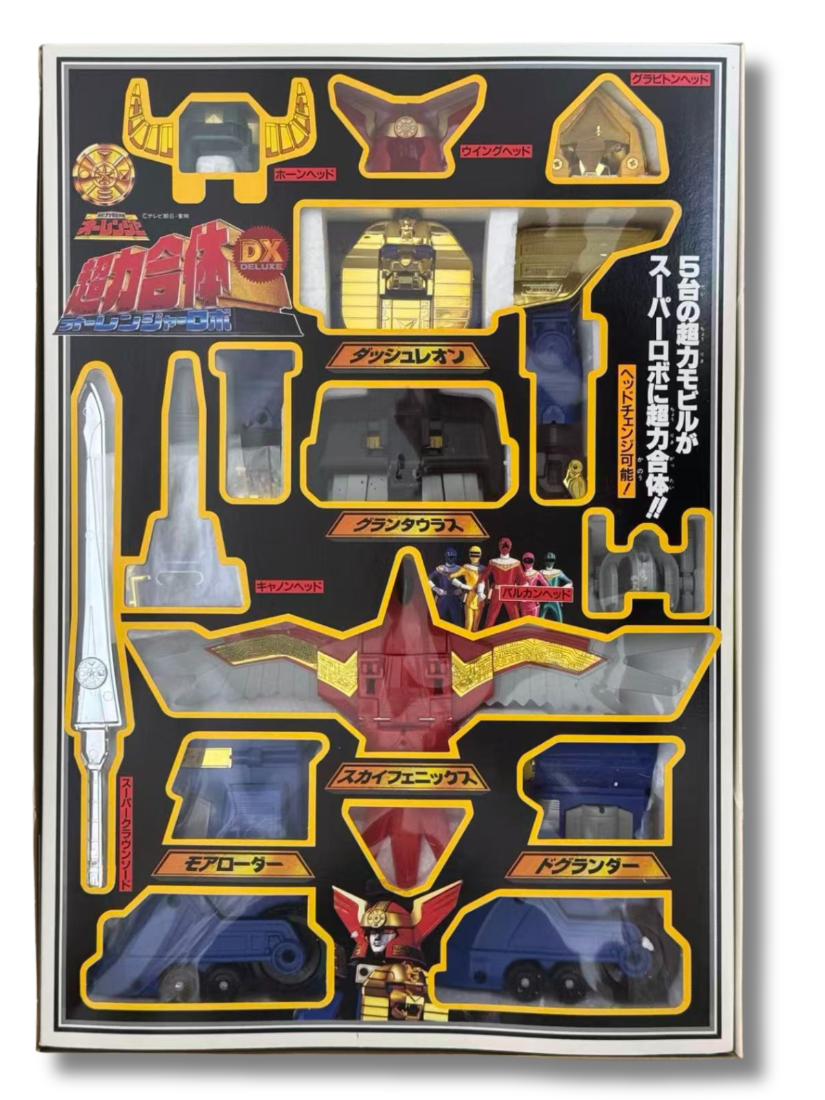 【商品概要】 1995年放送のスーパー戦隊シリーズ「超力戦隊オーレンジャー」より、 1号ロボ「超力合体 DXオーレンジャーロボ」です。 スカイフェニックス、グランタウラス、ダッシュレオン、ドグランダー、モアローダーの5台の超力モビルが合体。 最大の特徴である「ヘッドチェンジシステム」により、5種類のヘルメット(ウィング、ホーン、グラビトン、バルカン、キャノン)を換装して遊ぶことができます。 現在では非常に希少な日本製(MADE IN JAPAN)の当時物です。