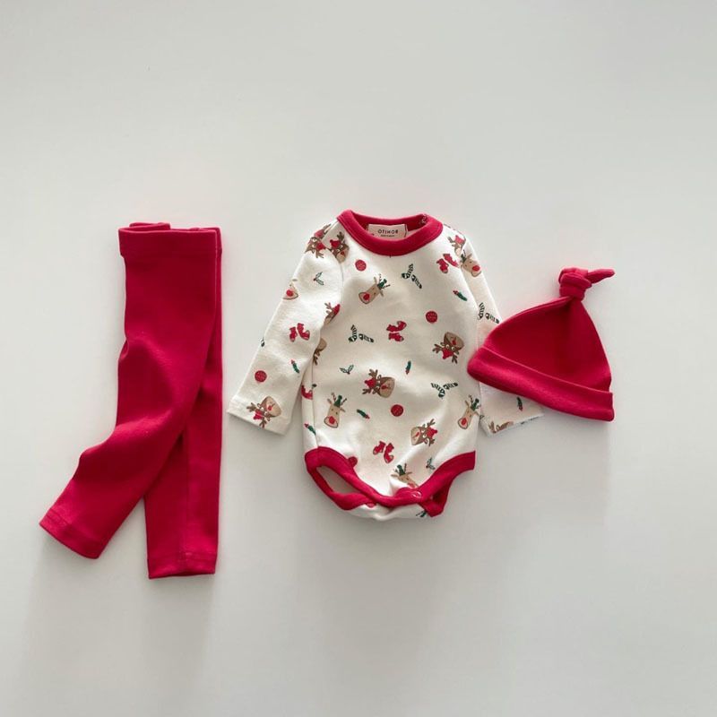 パイピングデザインのロンパースにはトナカイやオーナメントなどの柄が散りばめられています。