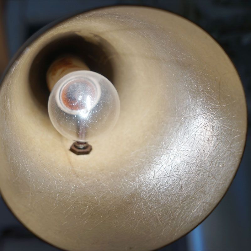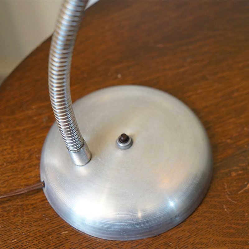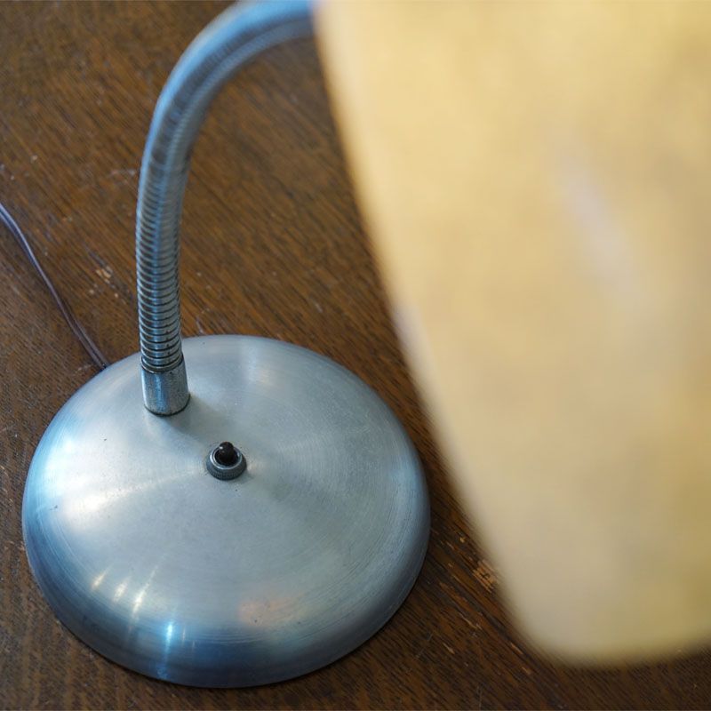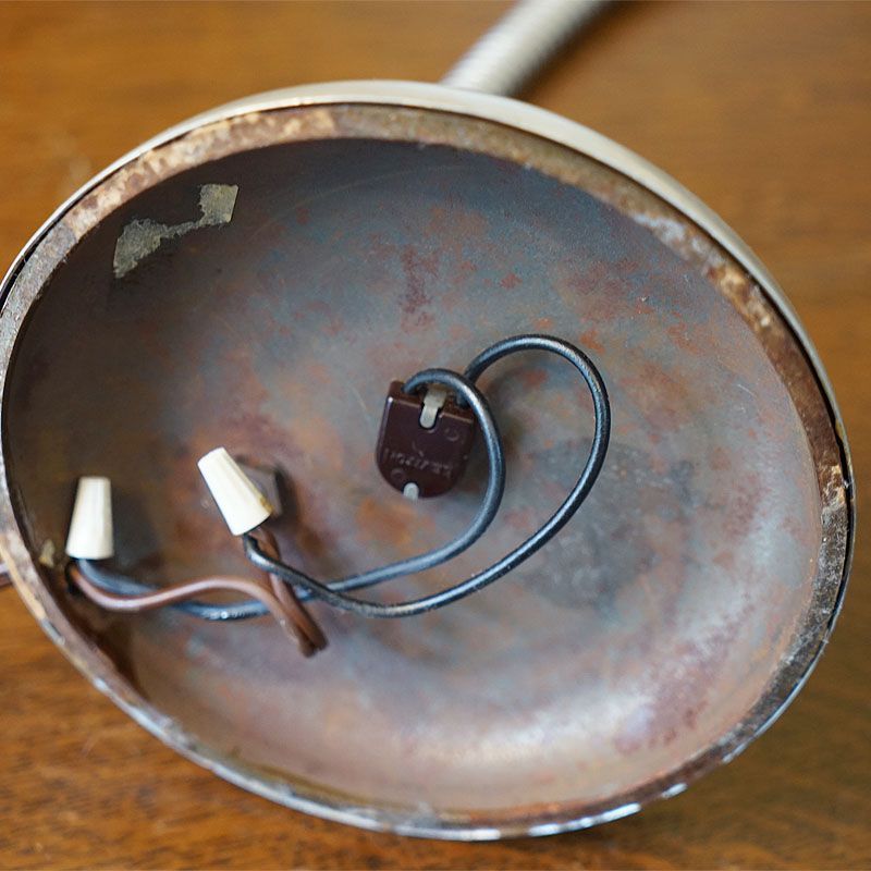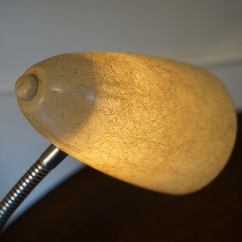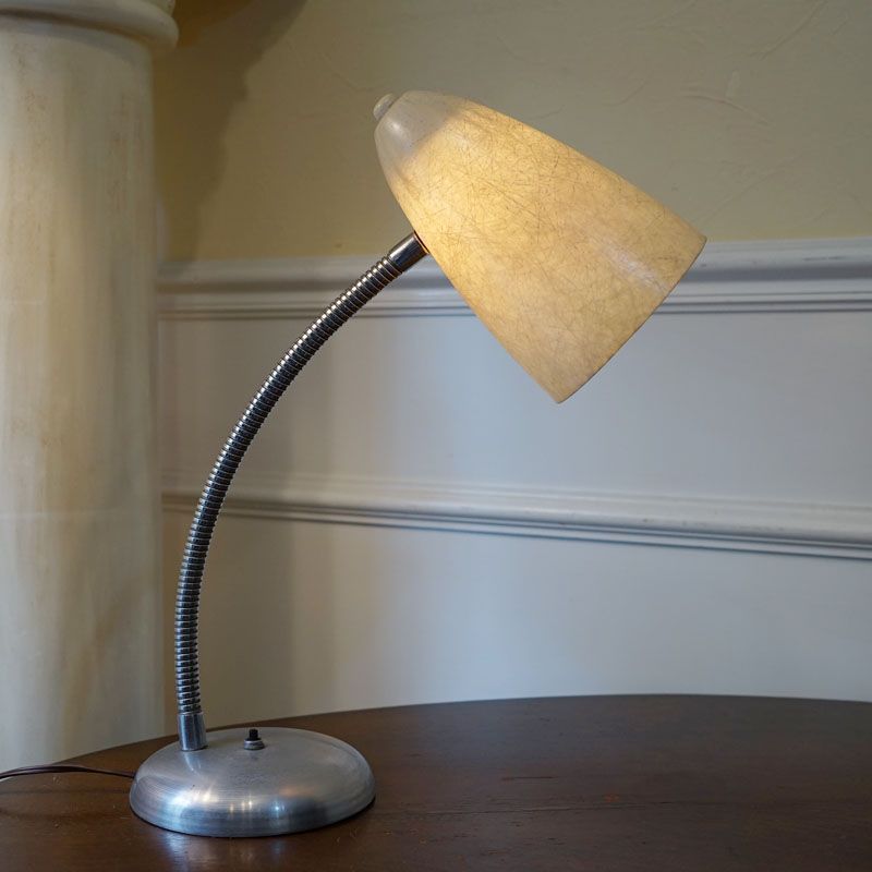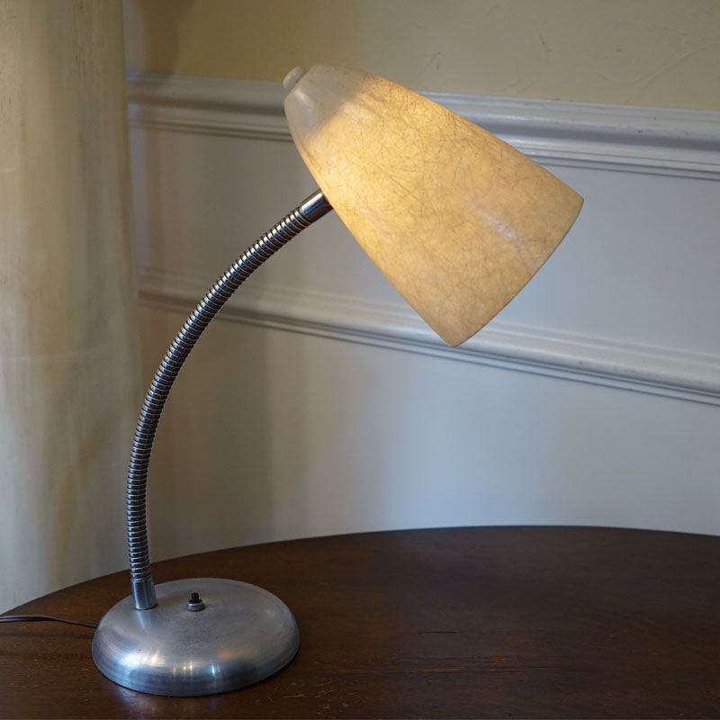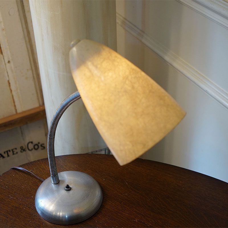 【コメント】ヴィンテージ・アメリカ製 フィフティーズのテーブルランプ 1灯です。シェードにはグラスファイバーを使用して支柱には自由に曲げられる素材を使い、ベースはクロームメッキ風のおしゃれな円型を使用している。質感と仕上げに存在感のあるランプです。