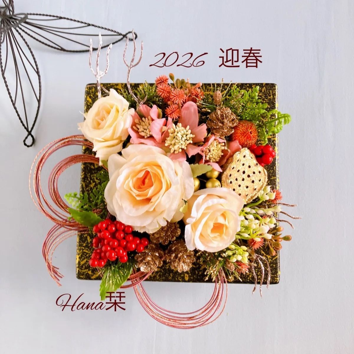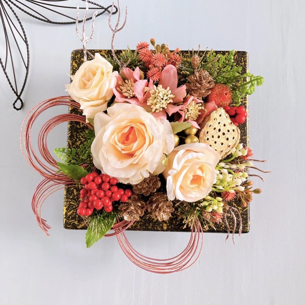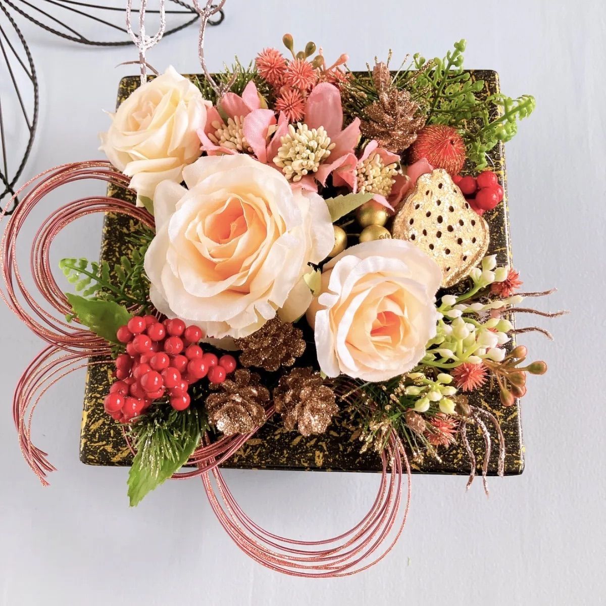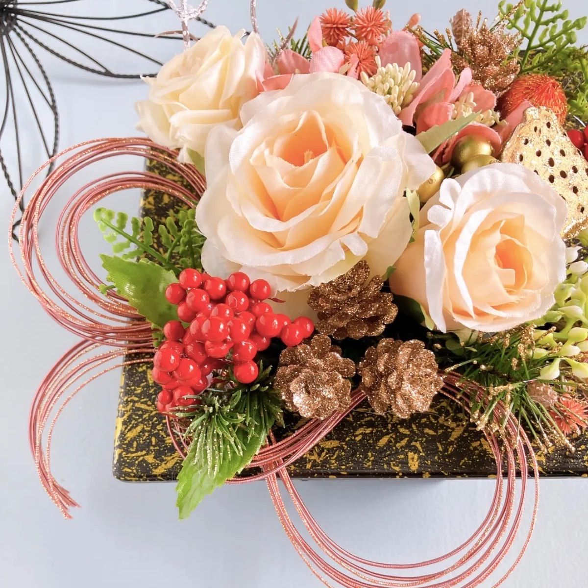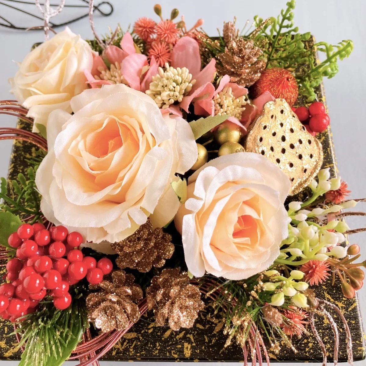 クリーム系の綺麗な薔薇とお正月の松や木の実や南天 蓮の実などキラキラした小物と和と洋のお花のアレンジです。
