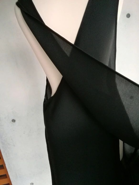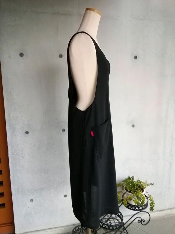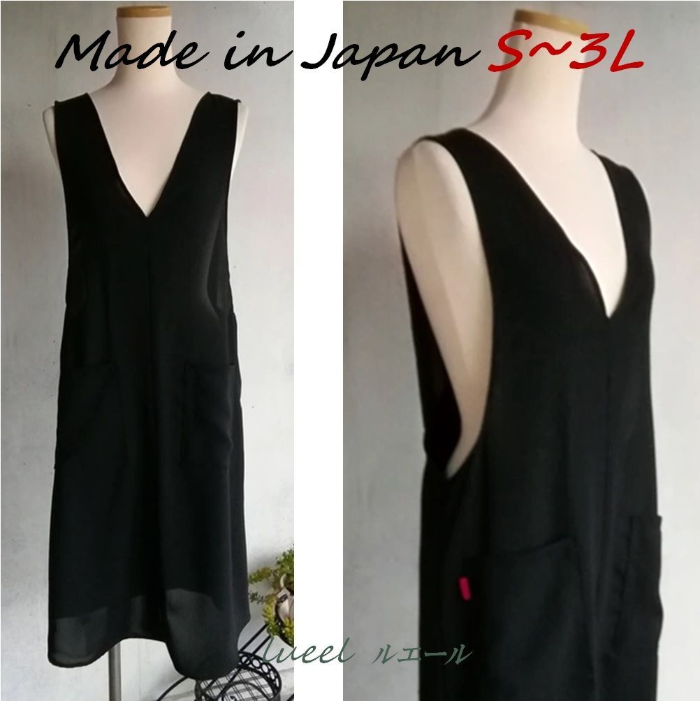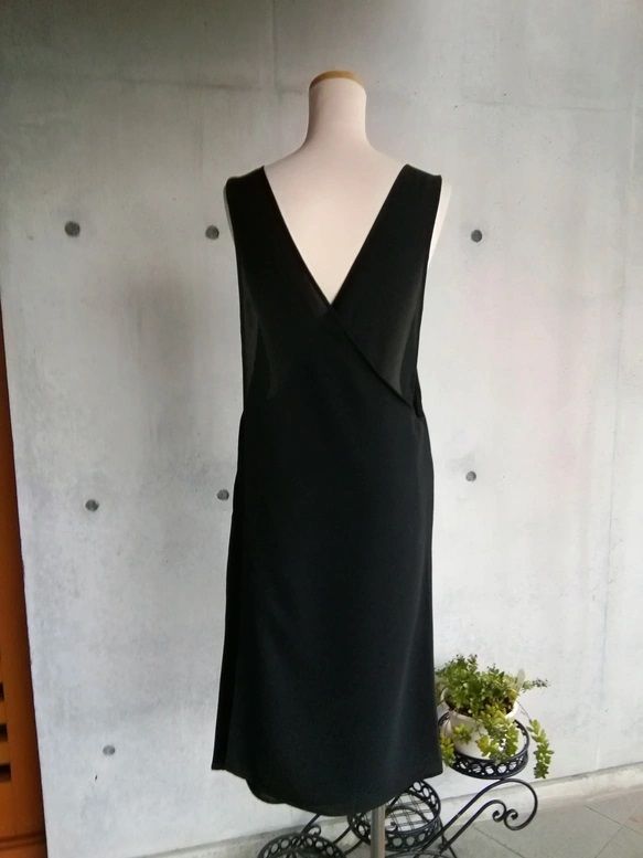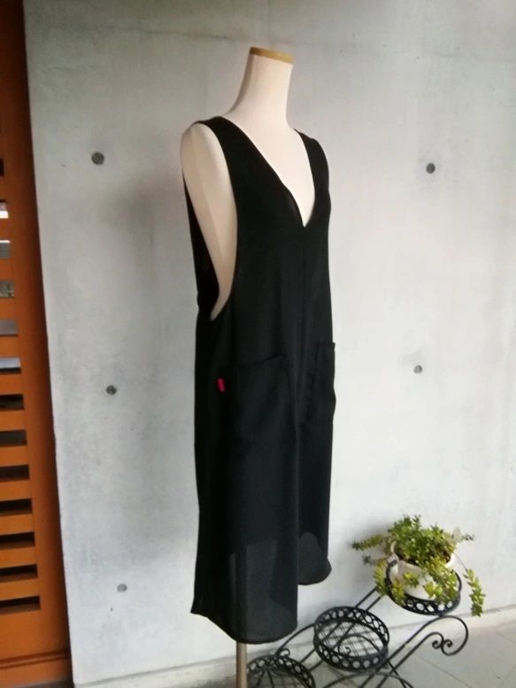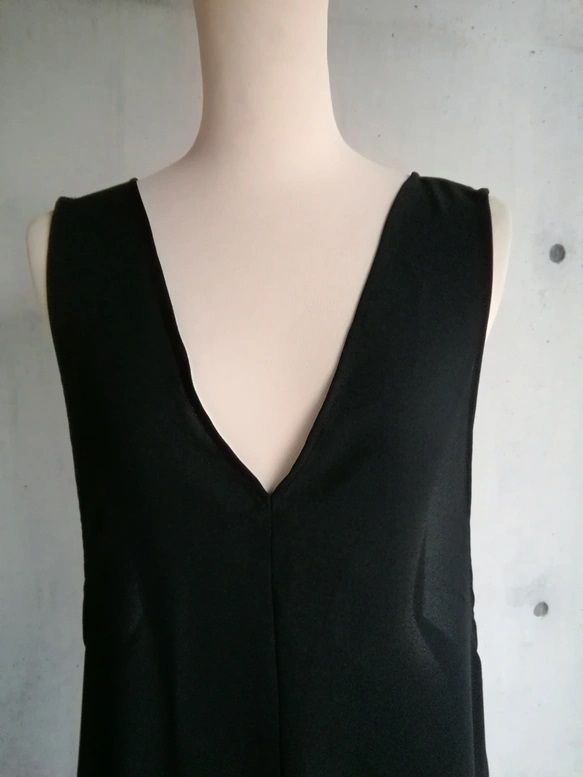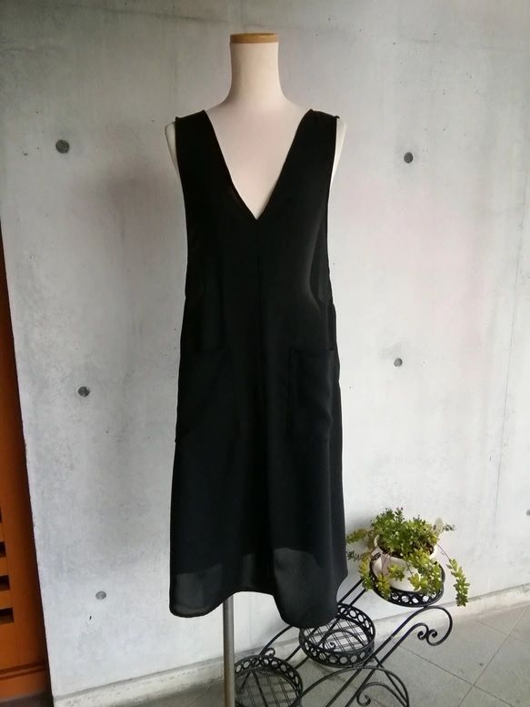 Vネックですっきり、身頃とスカート部分を1枚で仕上げていますので、ストンとしたシルエットでしっかりした生地ですが軽く仕上がっております。