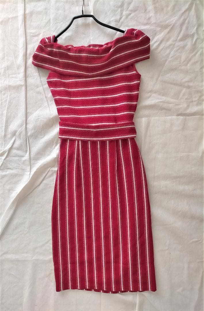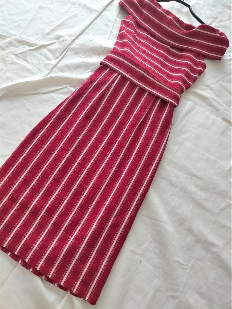 ボーダーのカットソーの生地を縦使いと横使いでMIXしたオフショルワンピース。