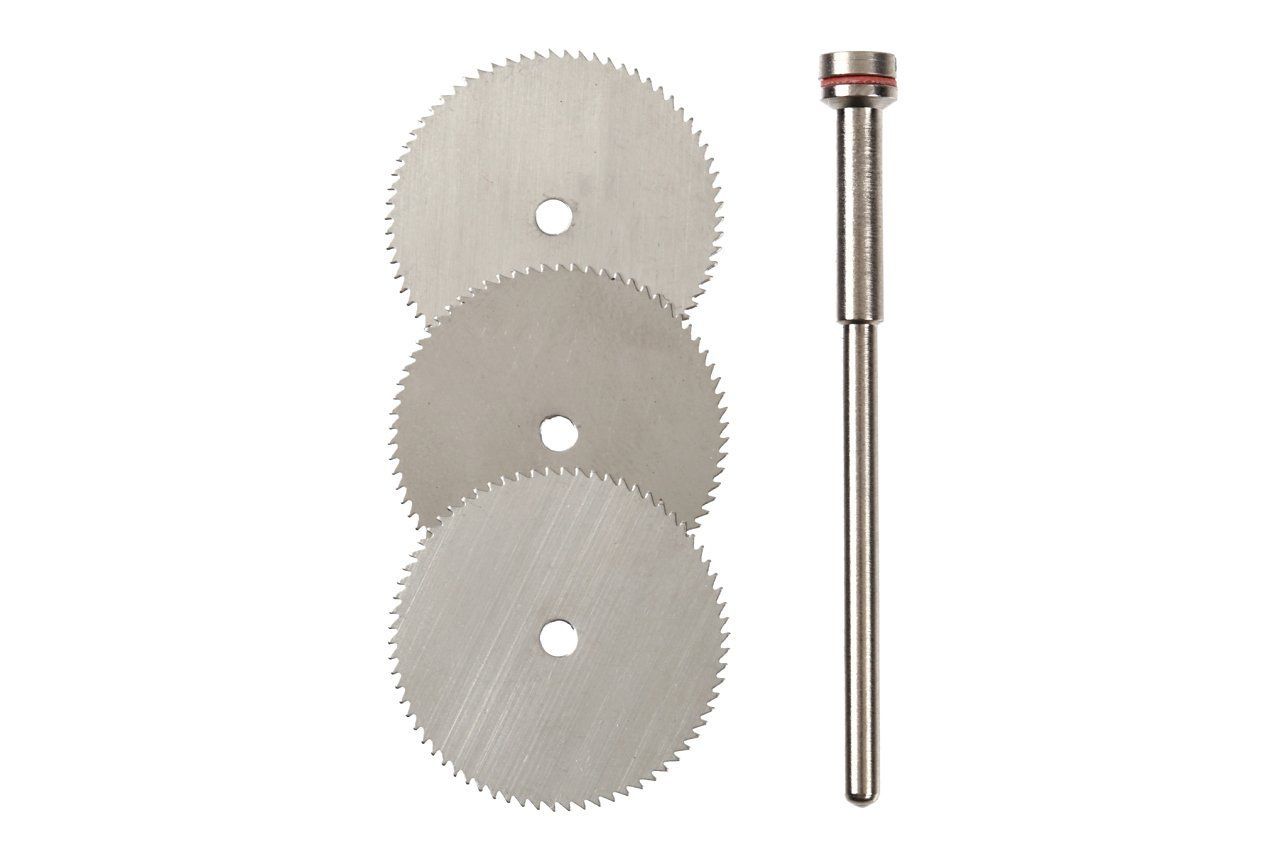 【用途】切断砥石は細い(薄い)金属、FRPの切断にご使用ください。小径丸のこ刃は木、アルミの薄板、プラスチックの切断にご使用ください。【特徴・機能】適合機種は2.35mm軸対応の各メーカーのミニルーター、電動ドリル等でご使用ください。切断砥石最高対応回転速度:25,000min(回/分)小径丸のこ刃最高対応回転速度:20,000min(回/分)●【使用上の注意】作業中は、必ず安全メガネなどの安全具を使用し、回転物に手や顔を絶対に近づけないようにしてください。指定された用途以外に使用しないでください。先端工具に変形・破損・曲りなどの異常がないか確認してから使用してください。芯振れをなくすためにできるだけチャックに近づけて、しっかりと締め付けてください。取り付けが緩いと、回転中にはずれて大変に危険です。先端工具を取り付けるときは、軸の突き出し(オーバーハング)13mm以下を必ず守ってください。使用するミニルーター、ルーター等、各メーカーの取扱説明書をよく読み、各メーカーの警告、注意をよく守ってください。小さなお子さまの近くでは使用しないでください。小さなお子さまの手の届かない場所に保管してください。