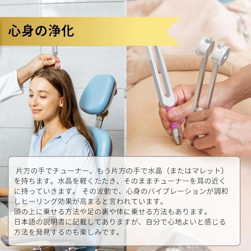 片方の手でチューナー、もう片方の手でマレット(木片や水晶)を持ちます。