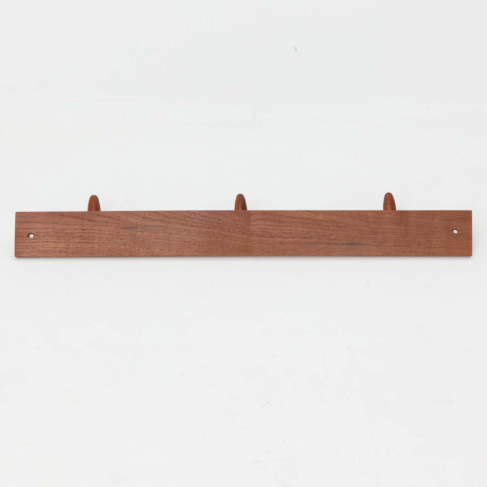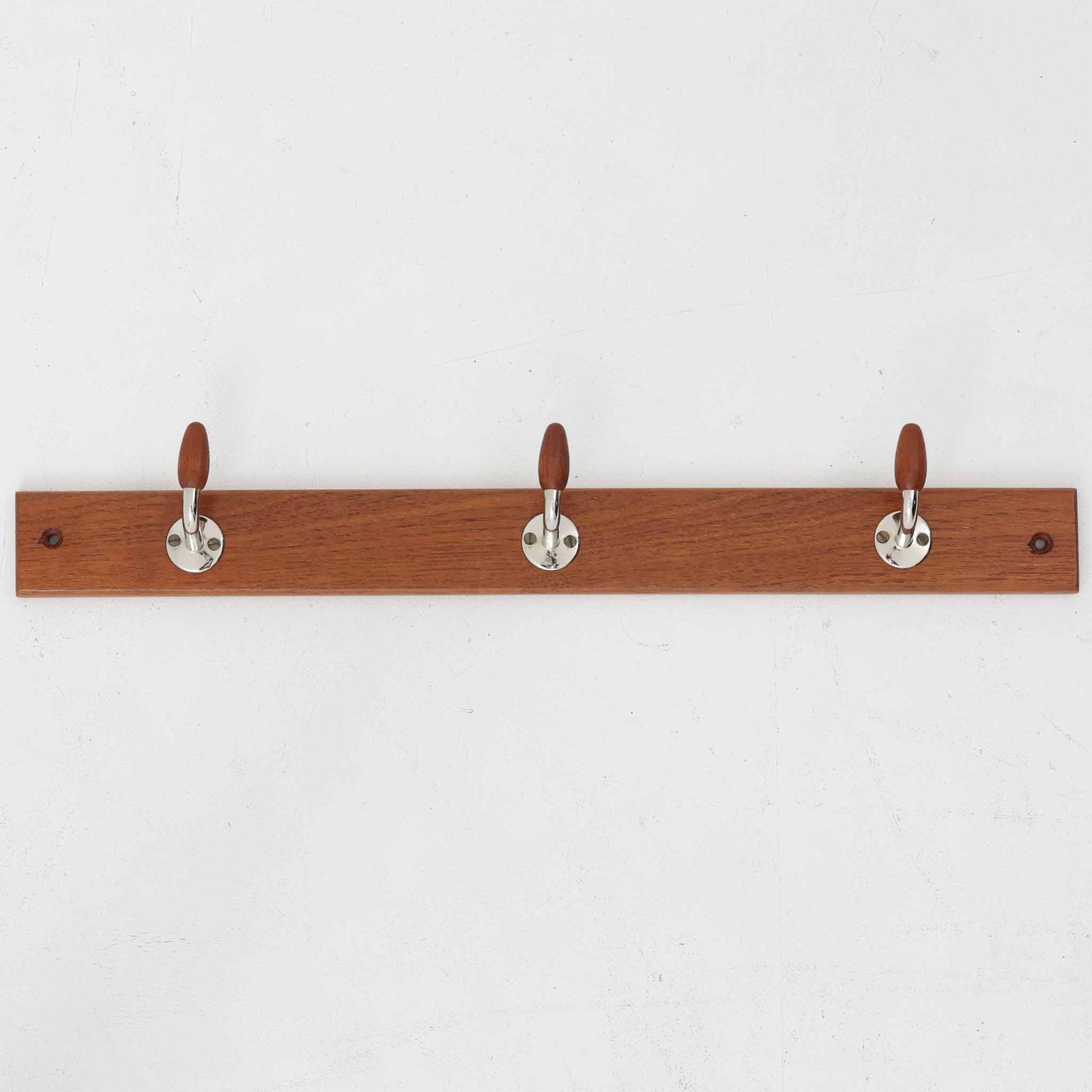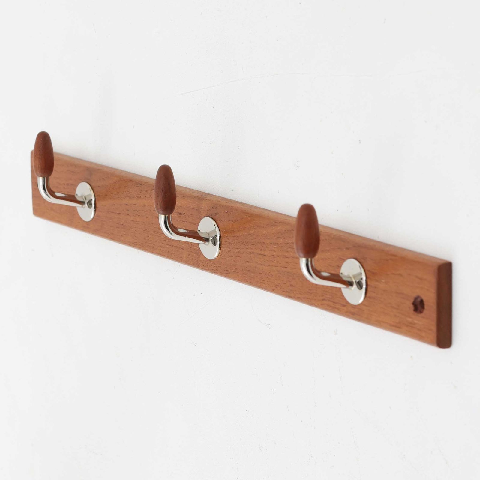 チーク材の温かみあるベースにメタル製の3連フックを組み合わせたデンマーク製のウォールハンガーです。丸みのある木製キャップ付きのフックはコートやバッグを掛けても傷つきにくく、機能性とデザイン性を両立した北欧ビンテージらしいディテールが魅力です。玄関や寝室、ワークスペースなど壁面を活用した収納に便利で、単体での使用はもちろん複数並べて使用しても美しく空間に溶け込みます。ミニマルなデザインでインテリアを選ばず永くお使いいただけるアイテムです。