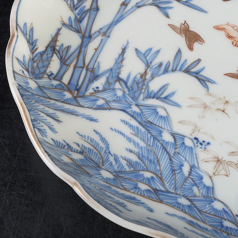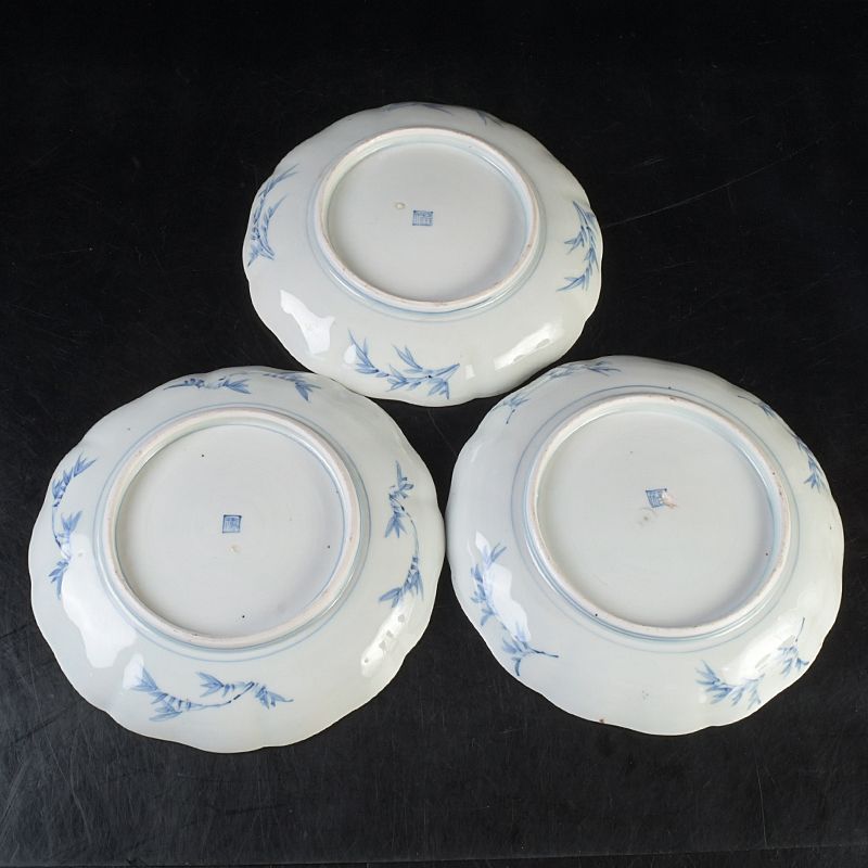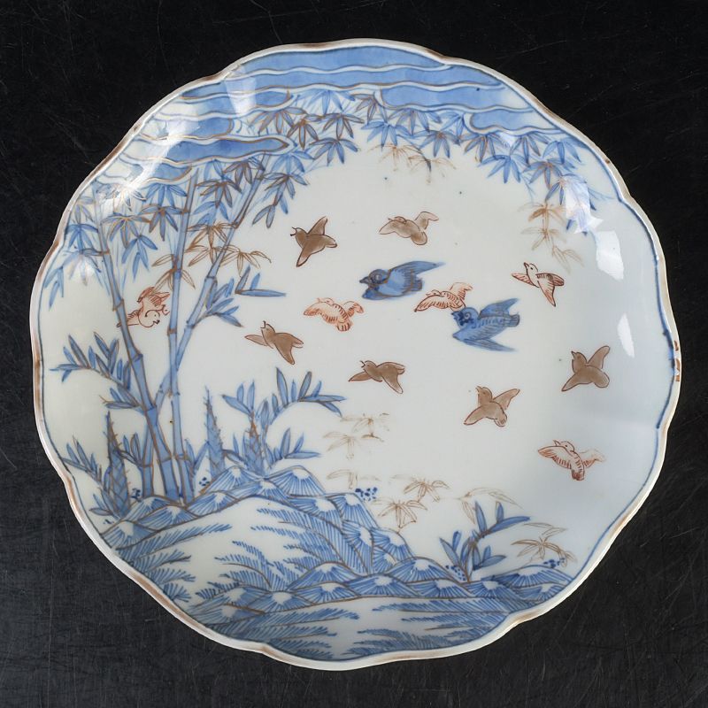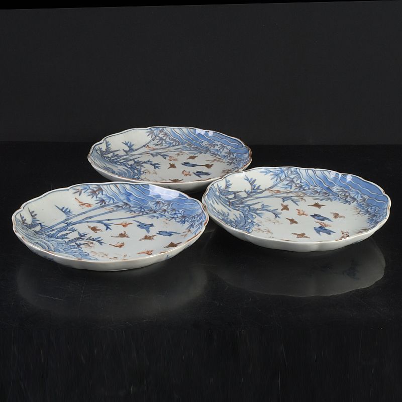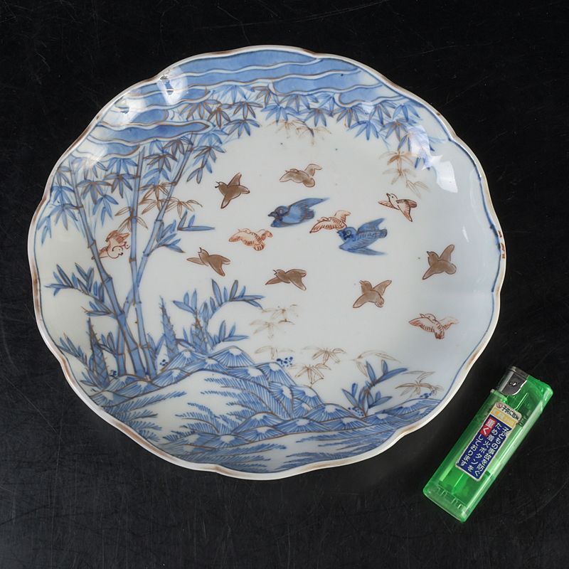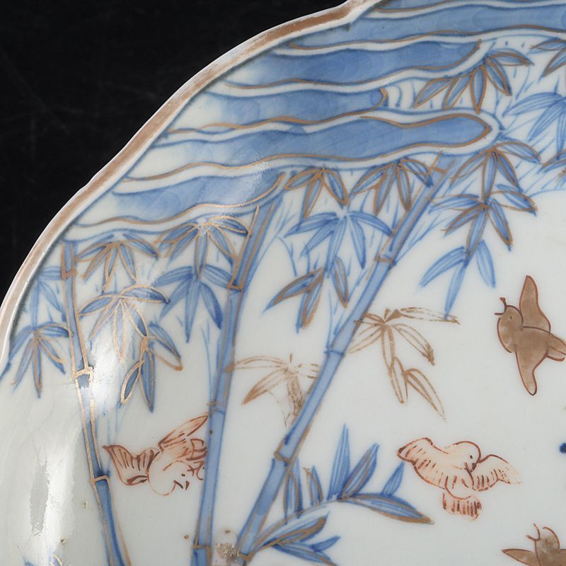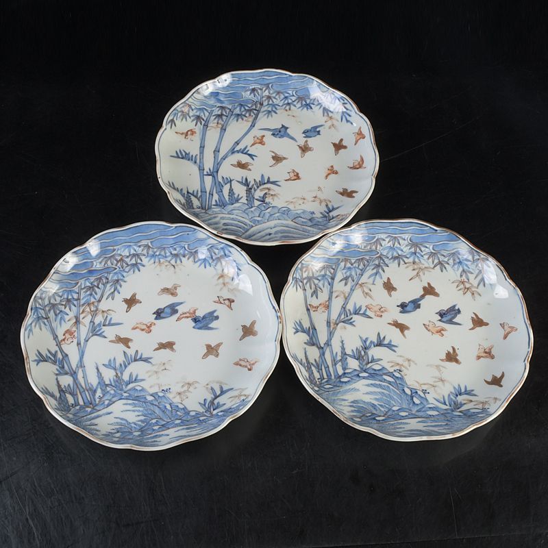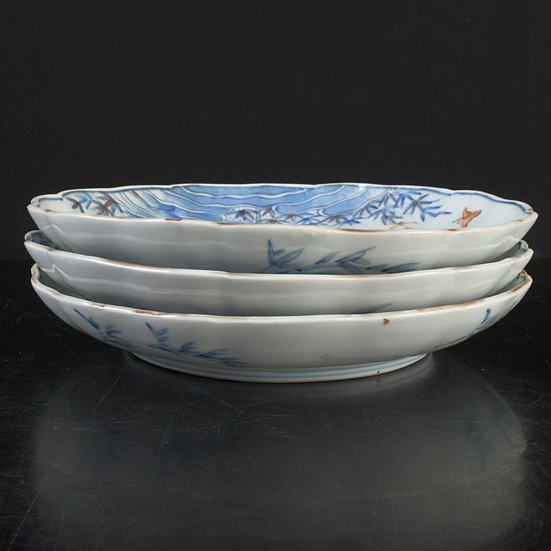 伊万里焼 染錦 竹鳥文 輪花皿 角福銘 三点 N S476