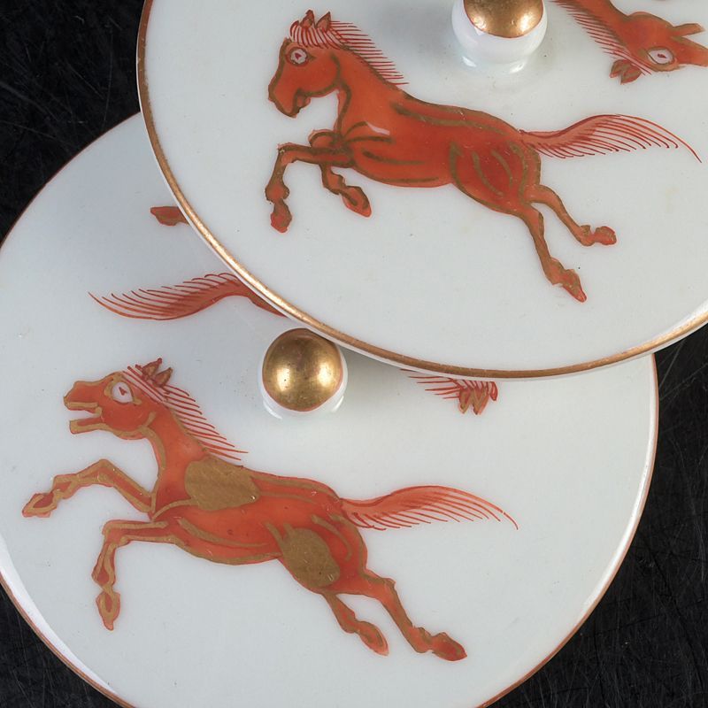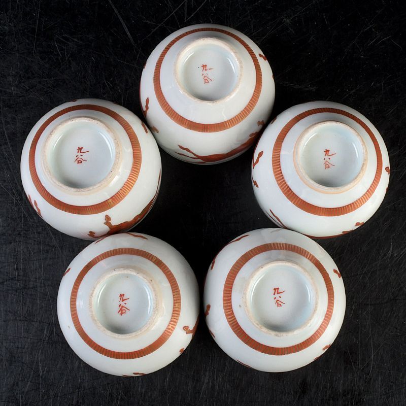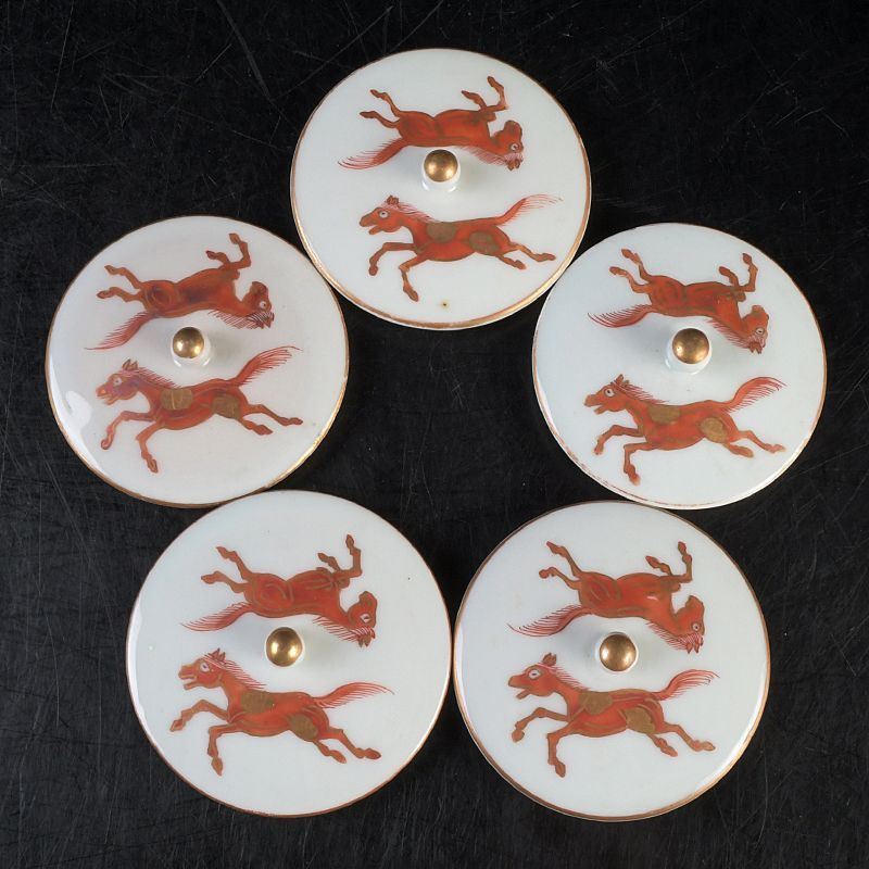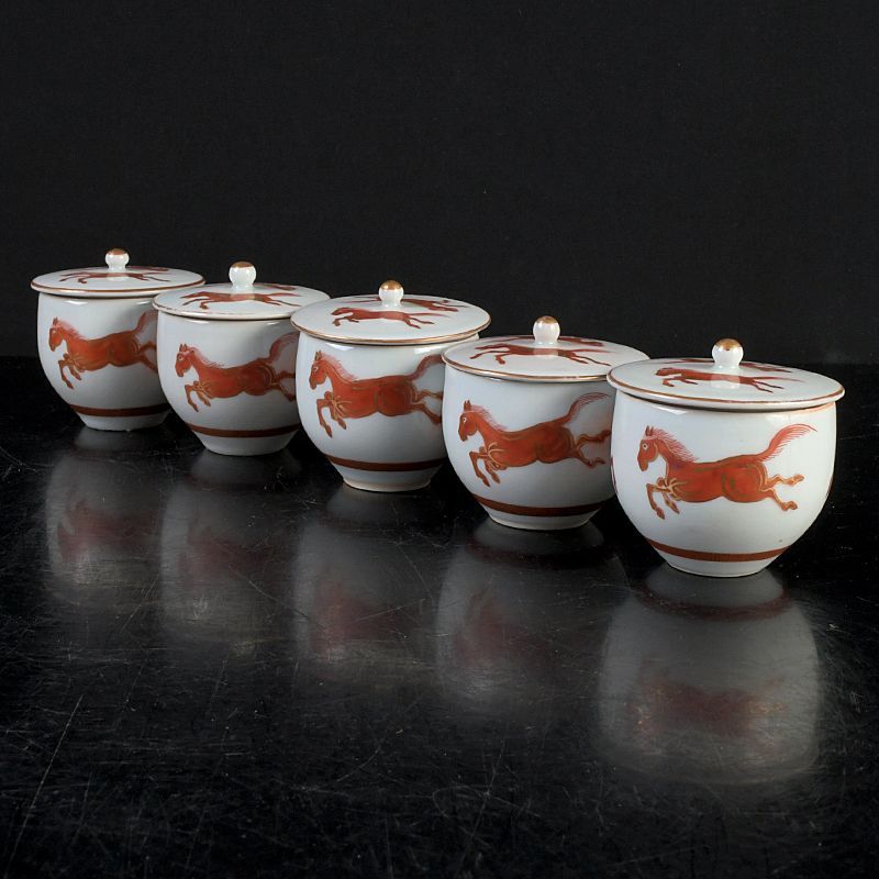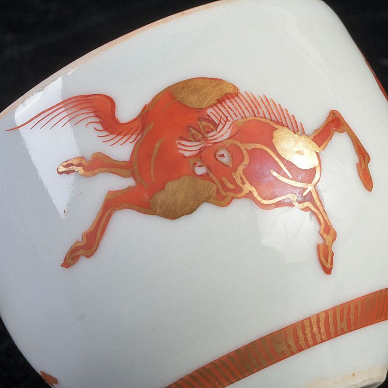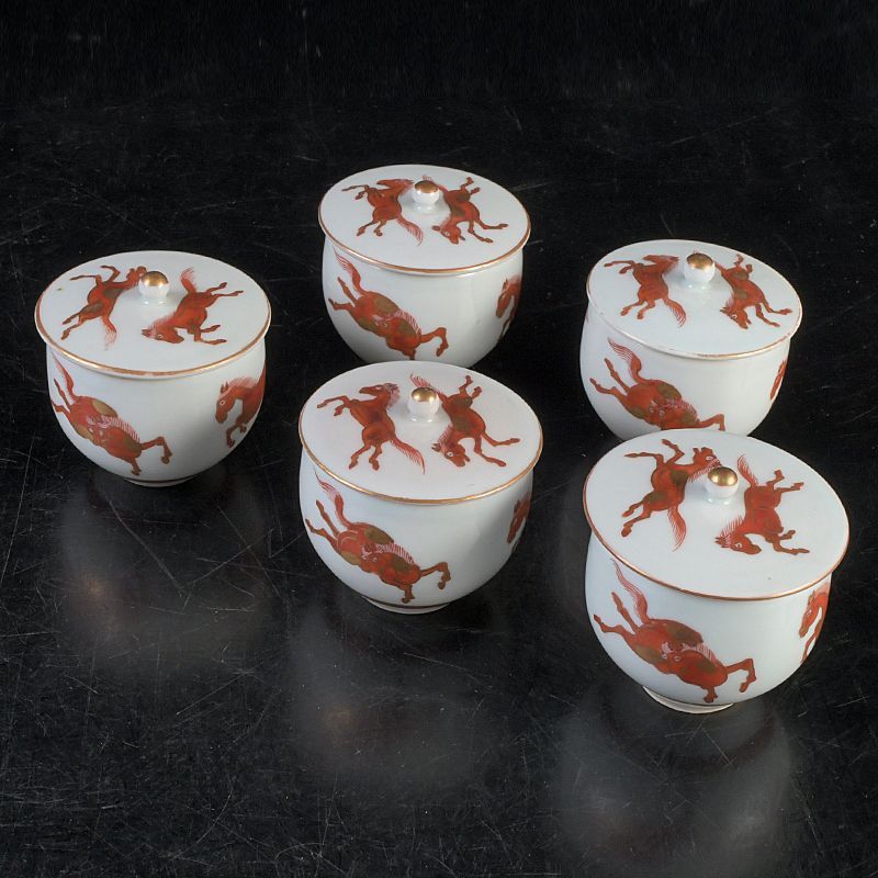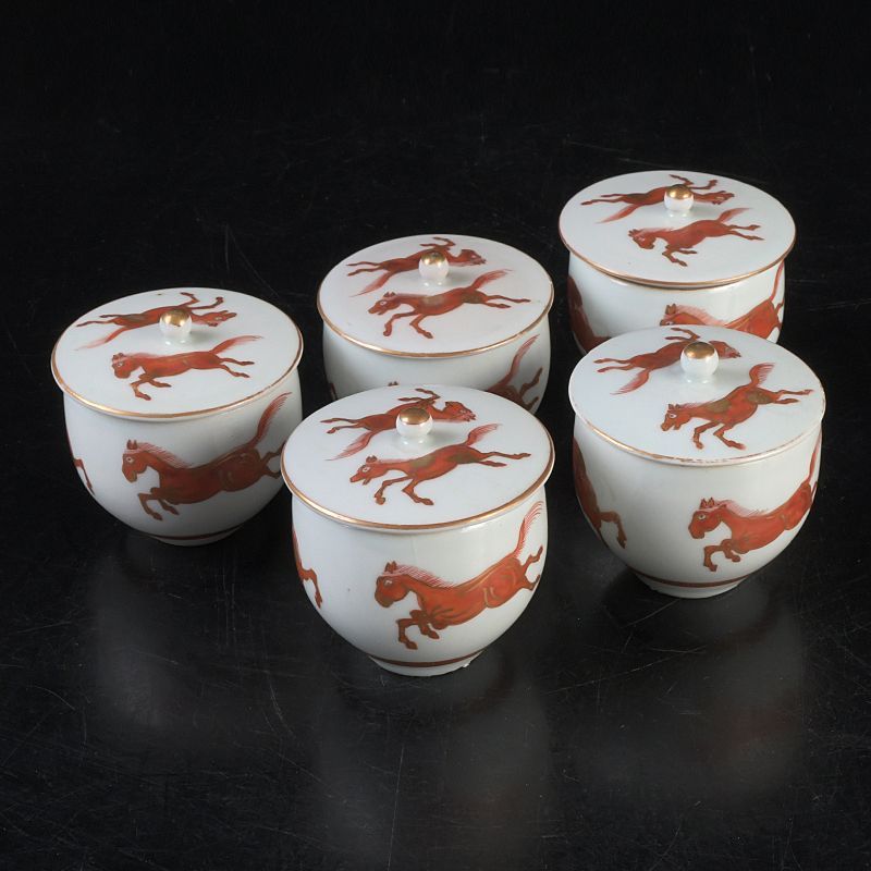 九谷焼 赤絵金彩 双馬文 蓋付煎茶碗 蓋碗 五客 C S477