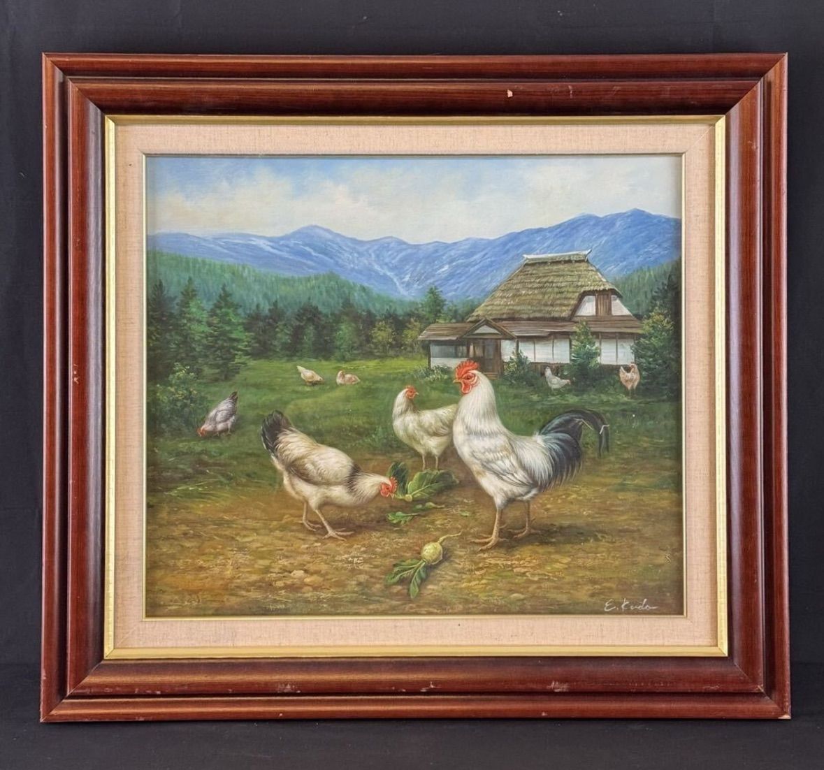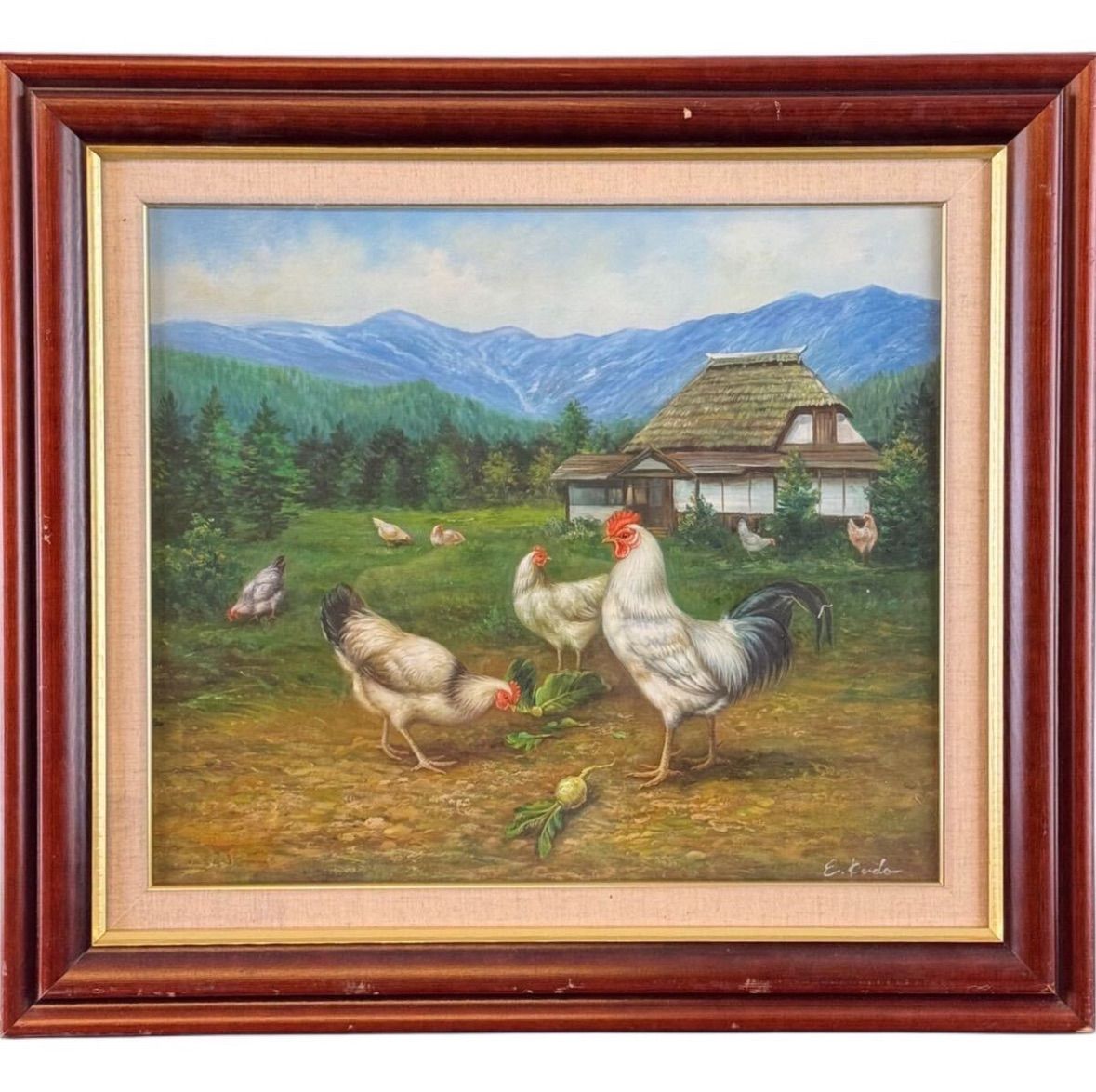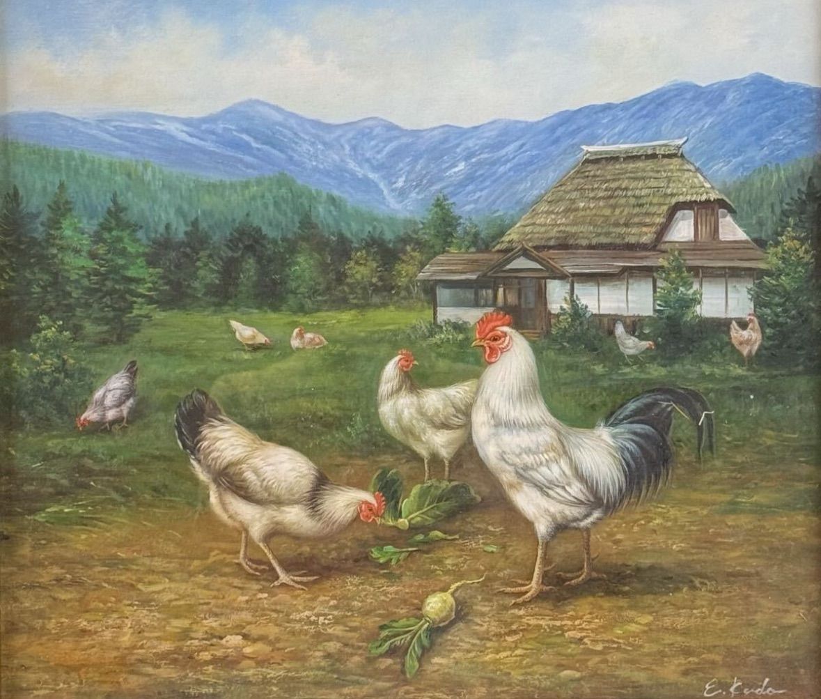 工藤栄進「にわとりと民家」油彩 10号 証明書あり 愛知県出身 八千代会所属 人気実力作家