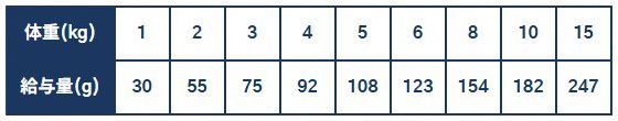※体重15キロを超える成犬には、体重5キロ増えるごとに、当フード45~55gを目安に足してください。