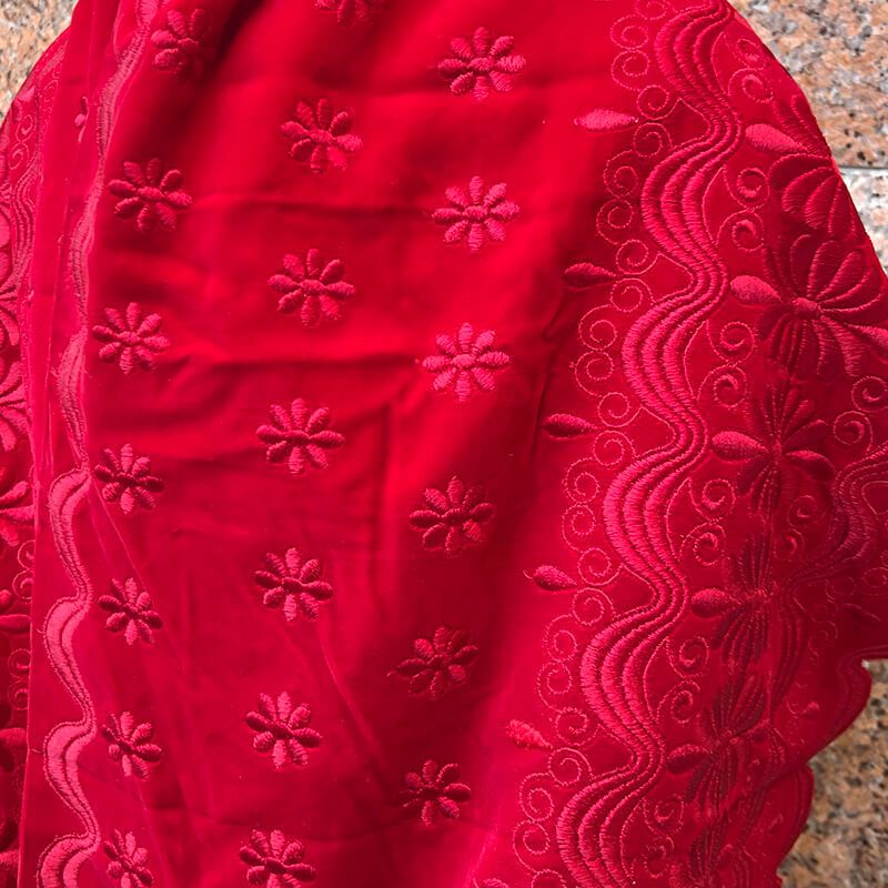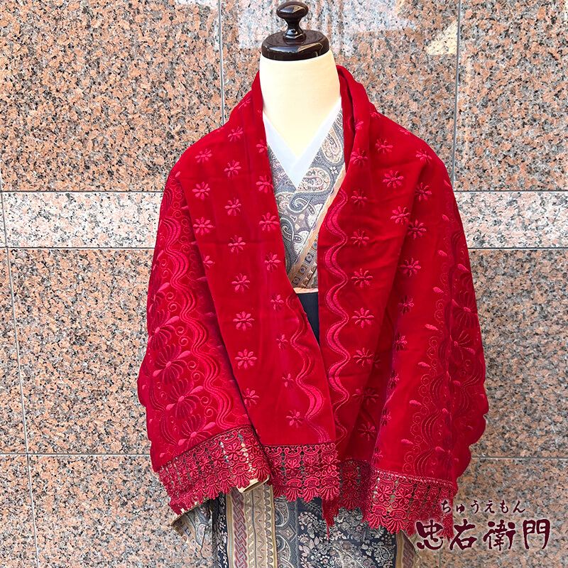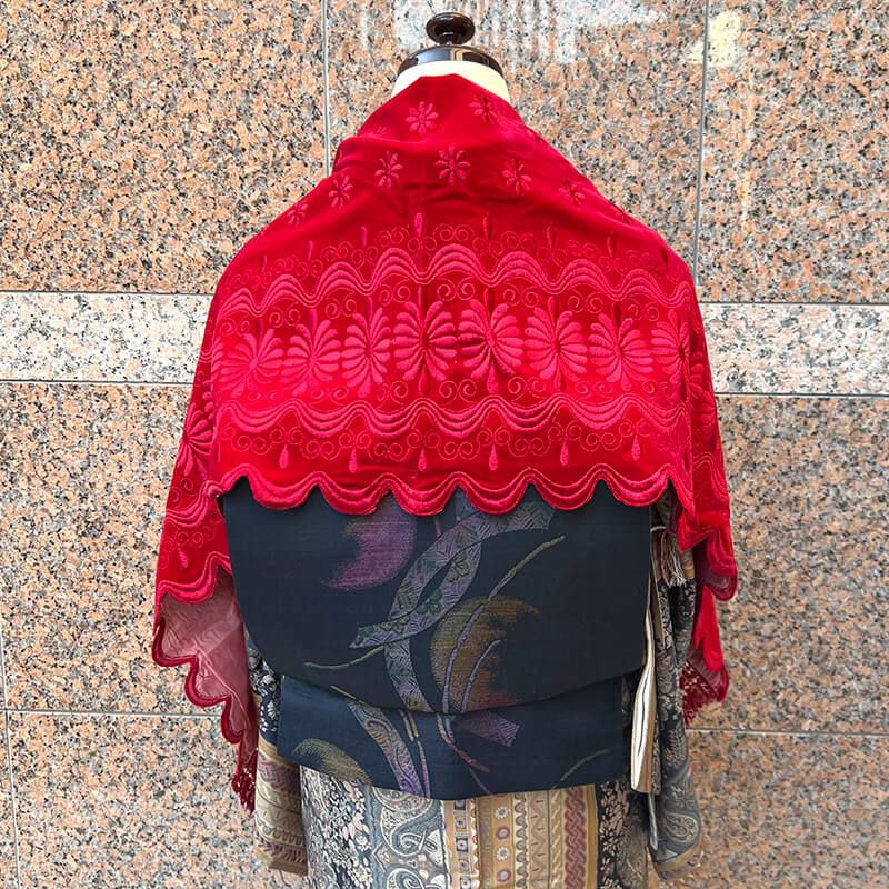 濃い目の赤に、地模様のように刺繍があしらわれたベルベットショール。 裏は、灰桃色です。クリスマスを感じさせる華やかな赤が素敵です。