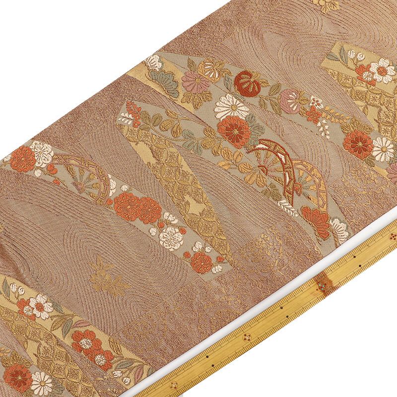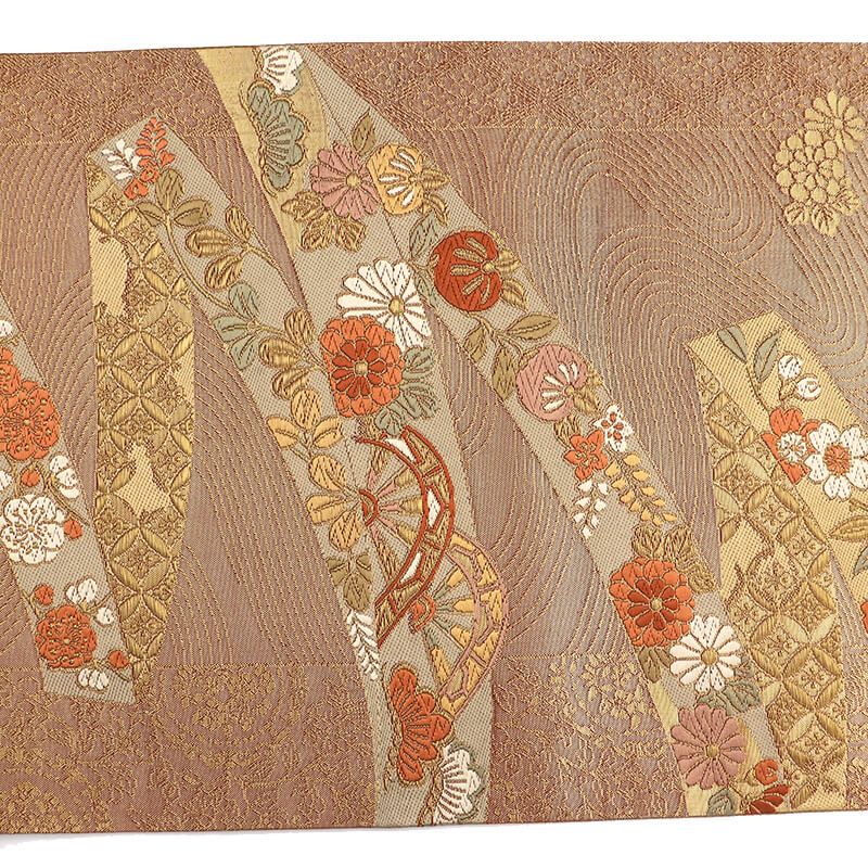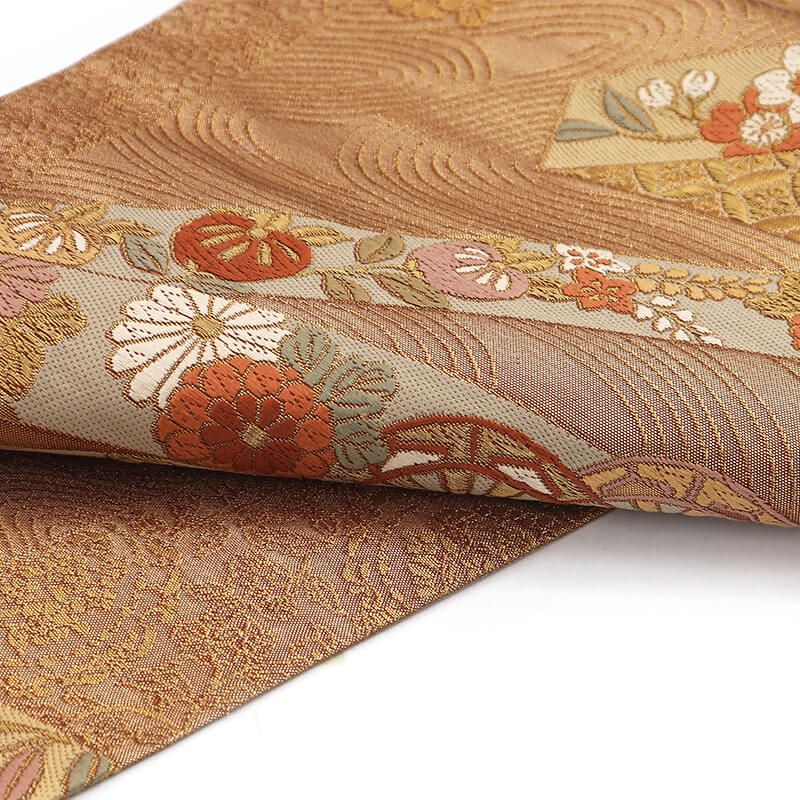 格調高い雰囲気の茶金の袋帯。熨斗に、橘や菊、七宝、片輪車などが、深みのある色合いで表現されております。全体的に落ち着きのある色使いを用いており、品格のあるスタイルをお楽しみいただけます。