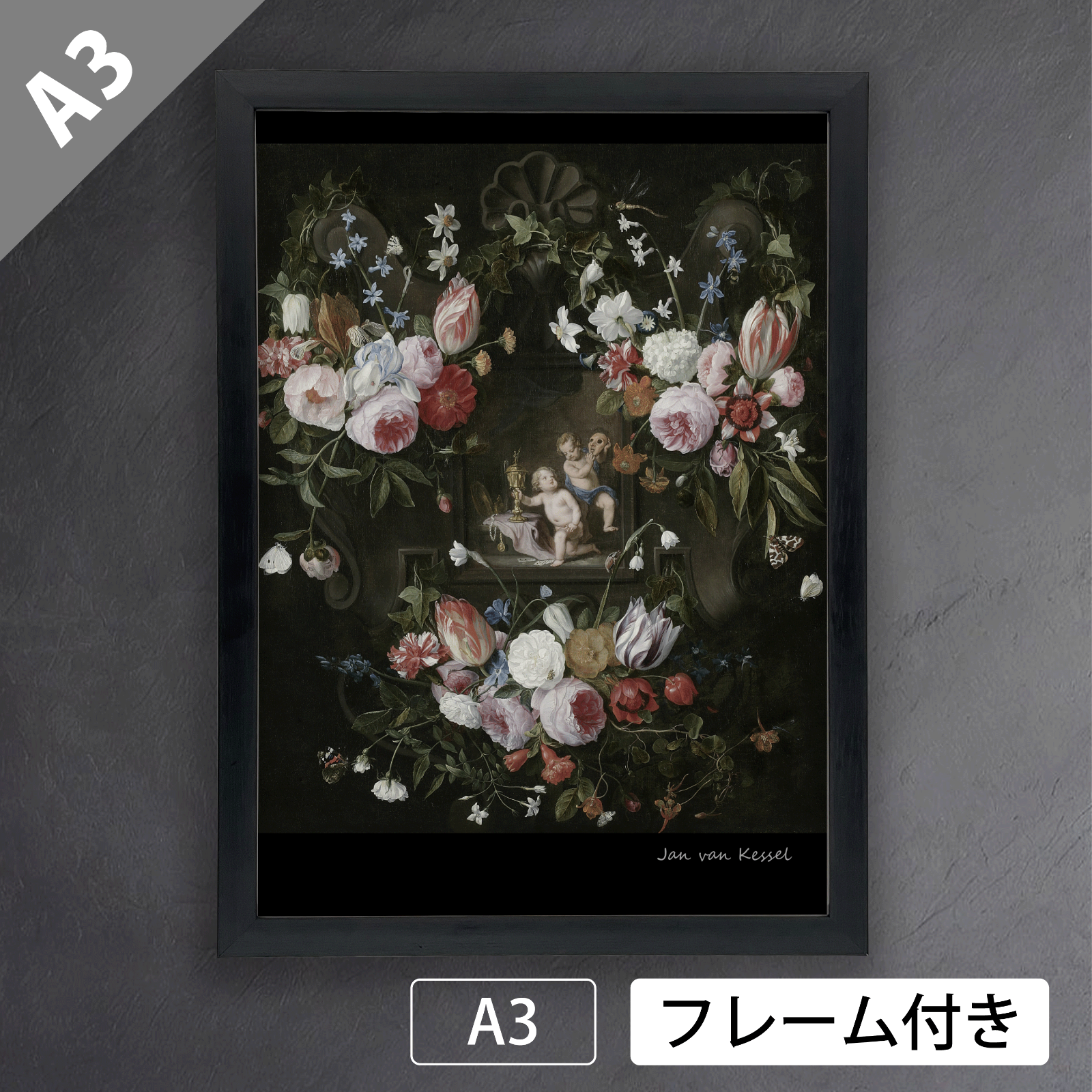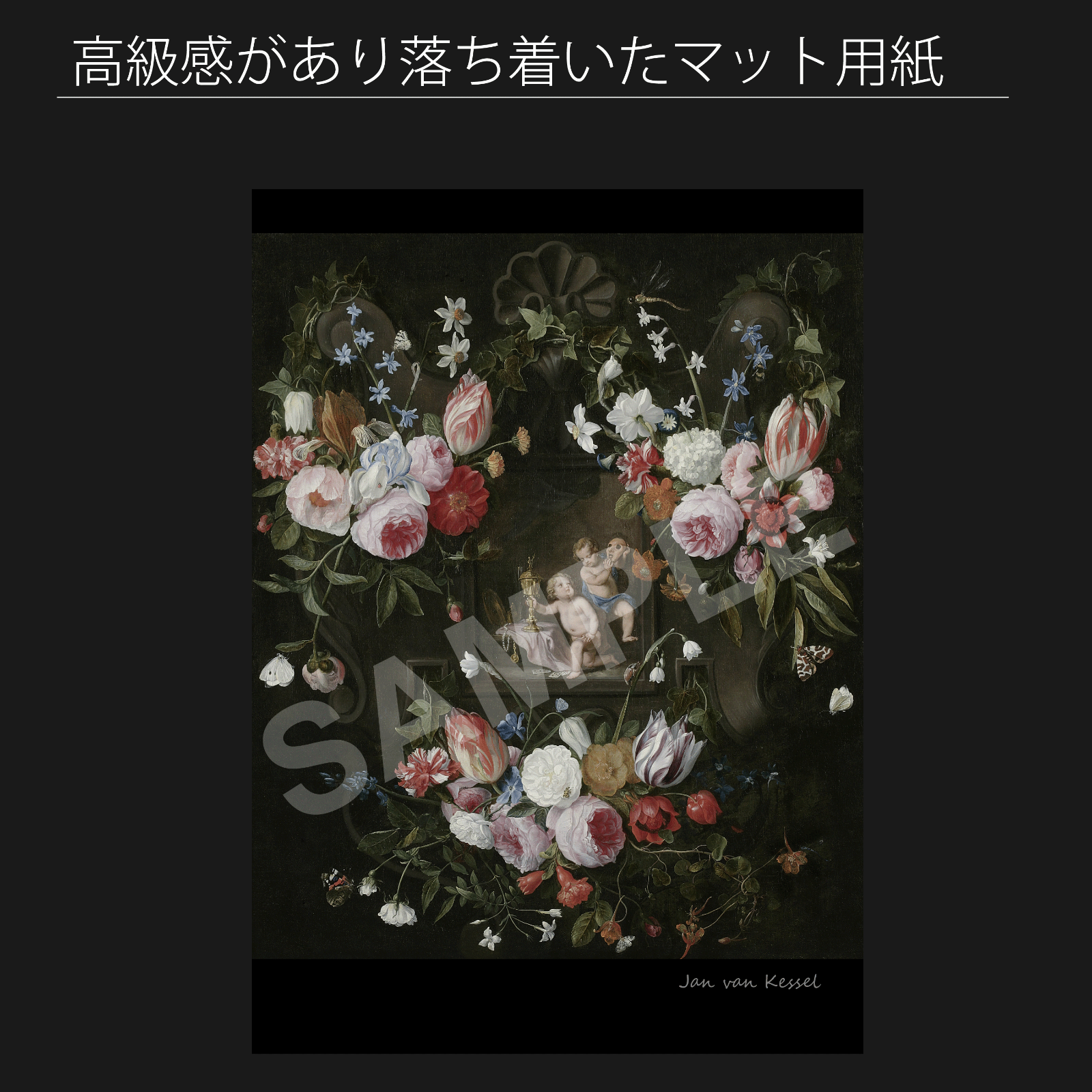 ヤン・ファン・ケッセル (父)(Jan van Kessel)『高価な品物と仮面をつけたプットーの寓意画を囲む花輪の静物画』をアートポスター化