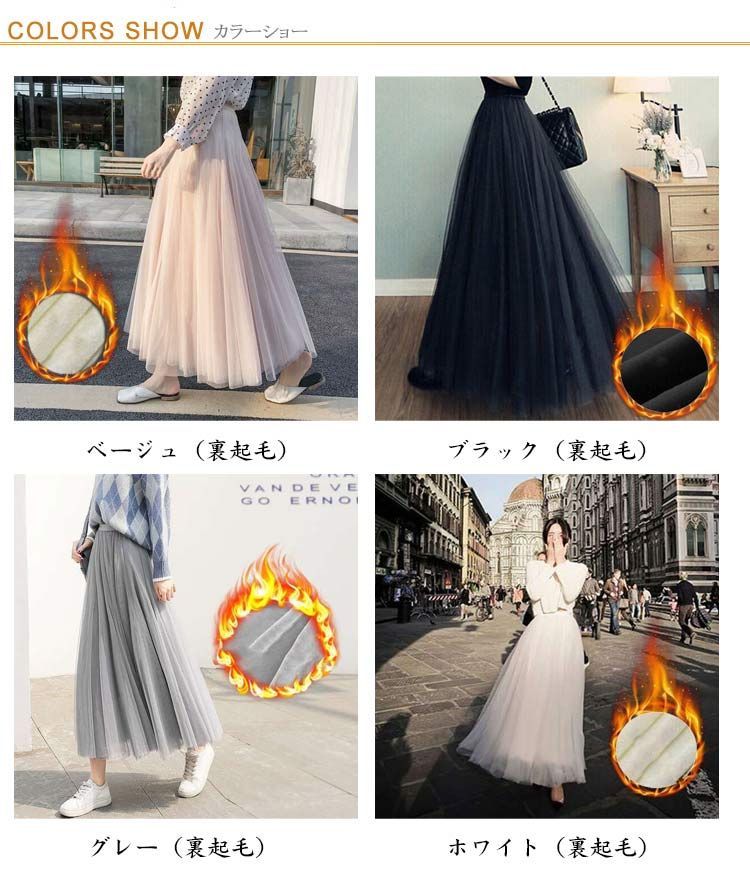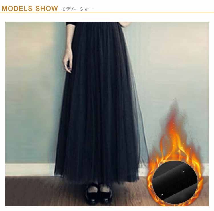 素脚に触れても暖かく優しい感触のフリース裏地付き、窮屈なタイツを履かなくても快適に寒い季節を過ごせるチュールスカート。