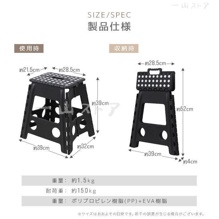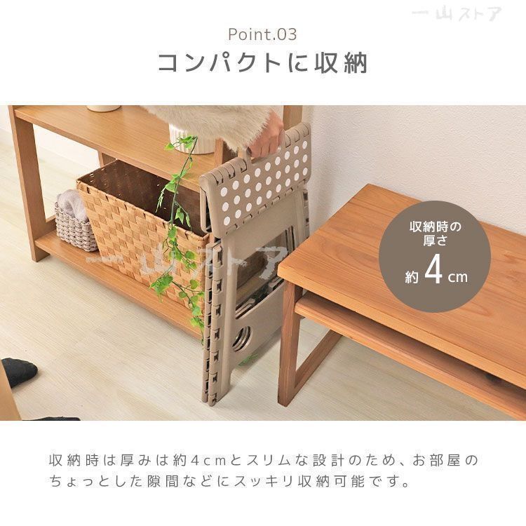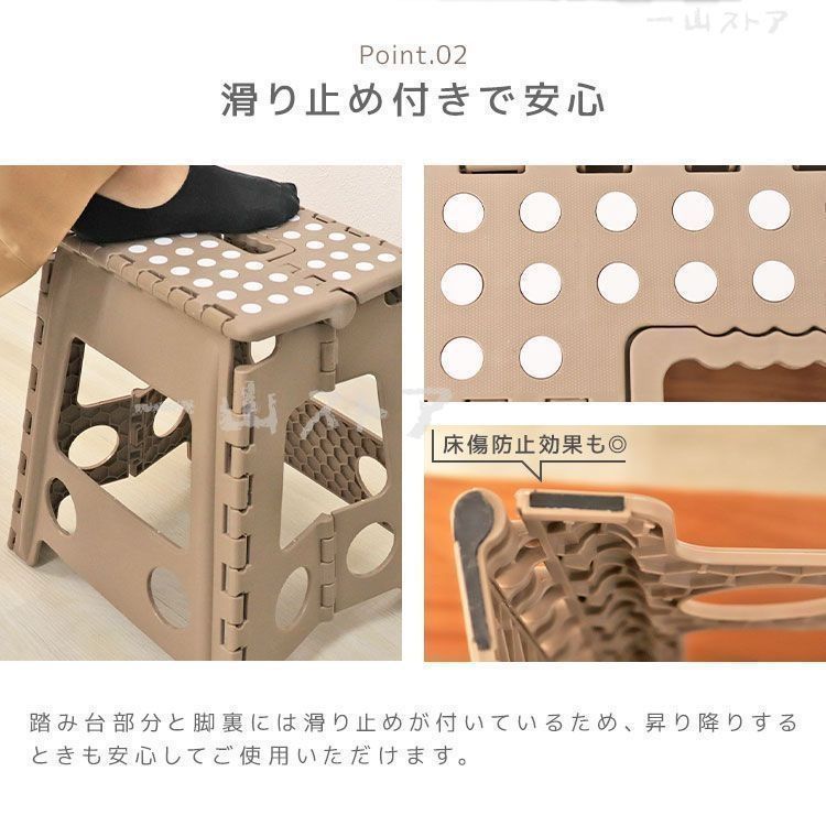 キッチンにて高いところのものを取ったり、玄関にて靴をはくときにちょっと腰掛けたり、野外に持ちだしてキャンプやスポーツのときの椅子としても活用できます。