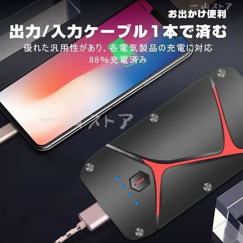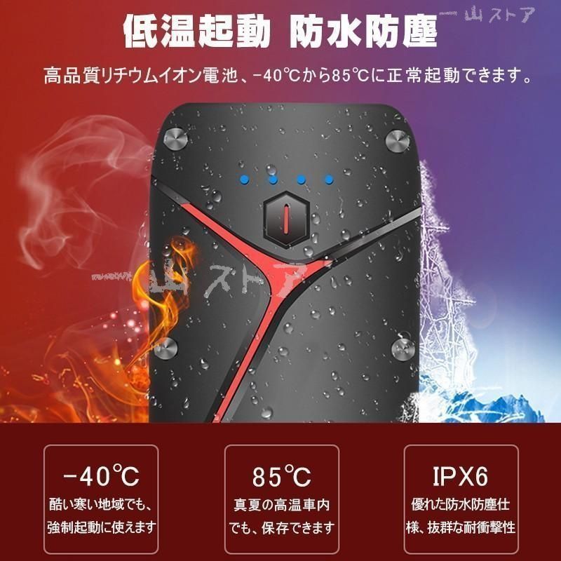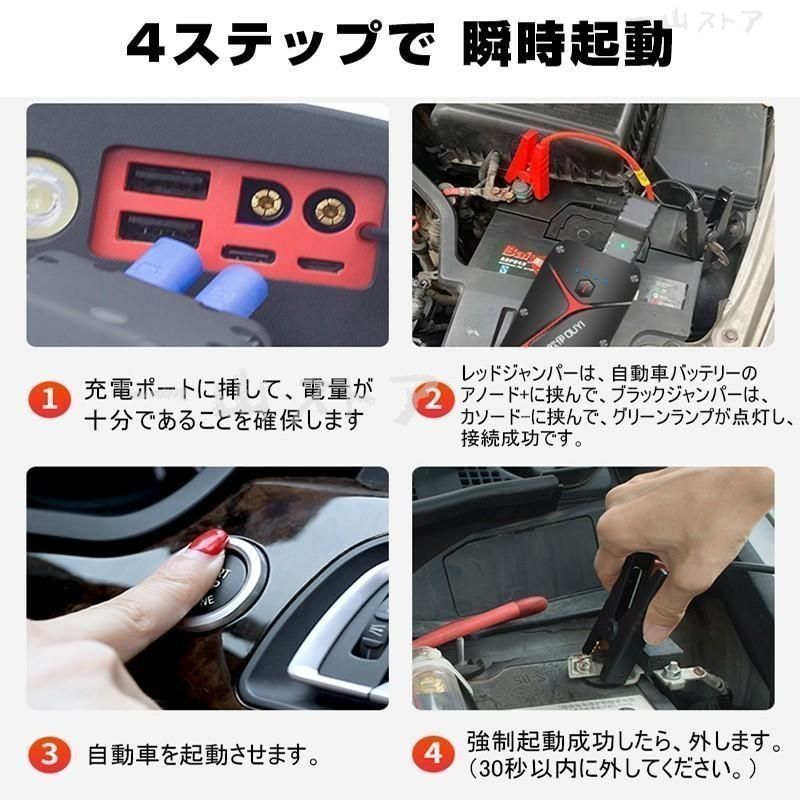 【ジャンプスターター機能】20000mAhの大容量、1200Aのピーク電流で、8L以下ガソリン、4L以下のディーゼル12V車両に対応しております、満タンの場合にはエンジンを数回連続に始動させることができます。車だけではなくオートバイ、モーターボート、軽トラなどにも適用です!
