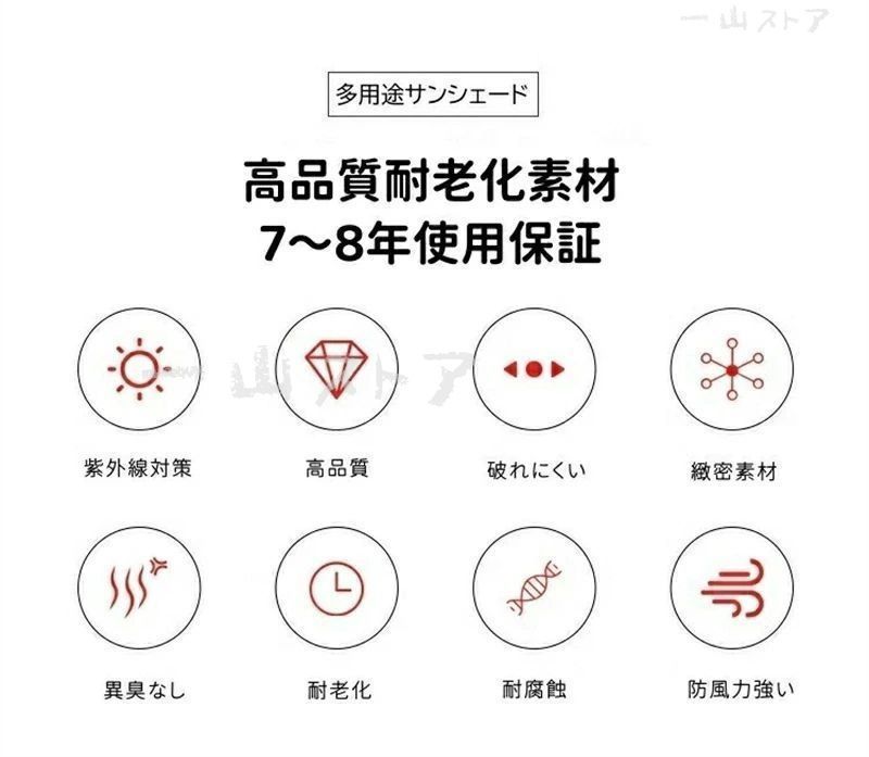 付属品:取り付け紐 10m×1本(付属のロープを必要な長さにカットして、簡単、安全、自由自在にシェードをお取付けます。/注文する内容によってロープの数も増える/ロープの数は必要があれば弊店までお気軽にメール下さい)