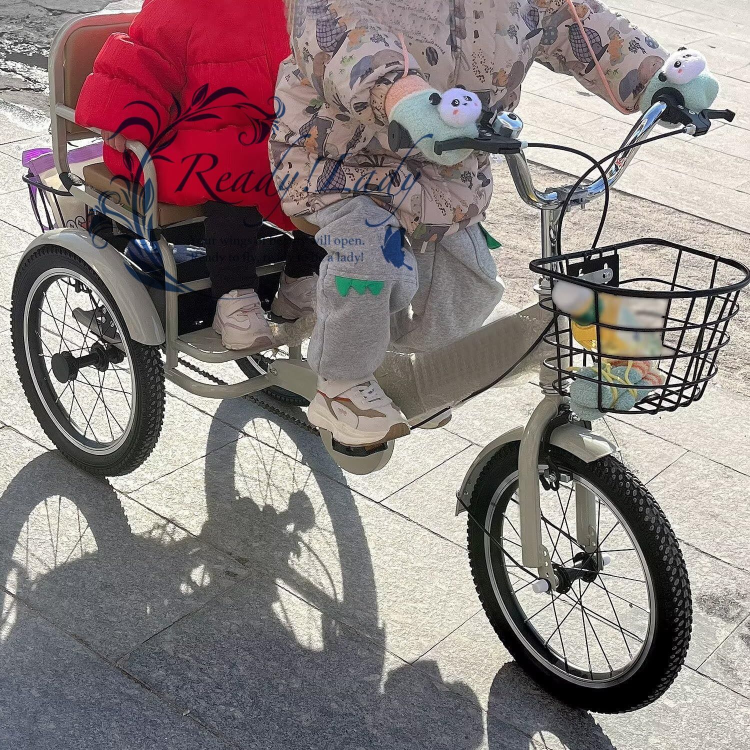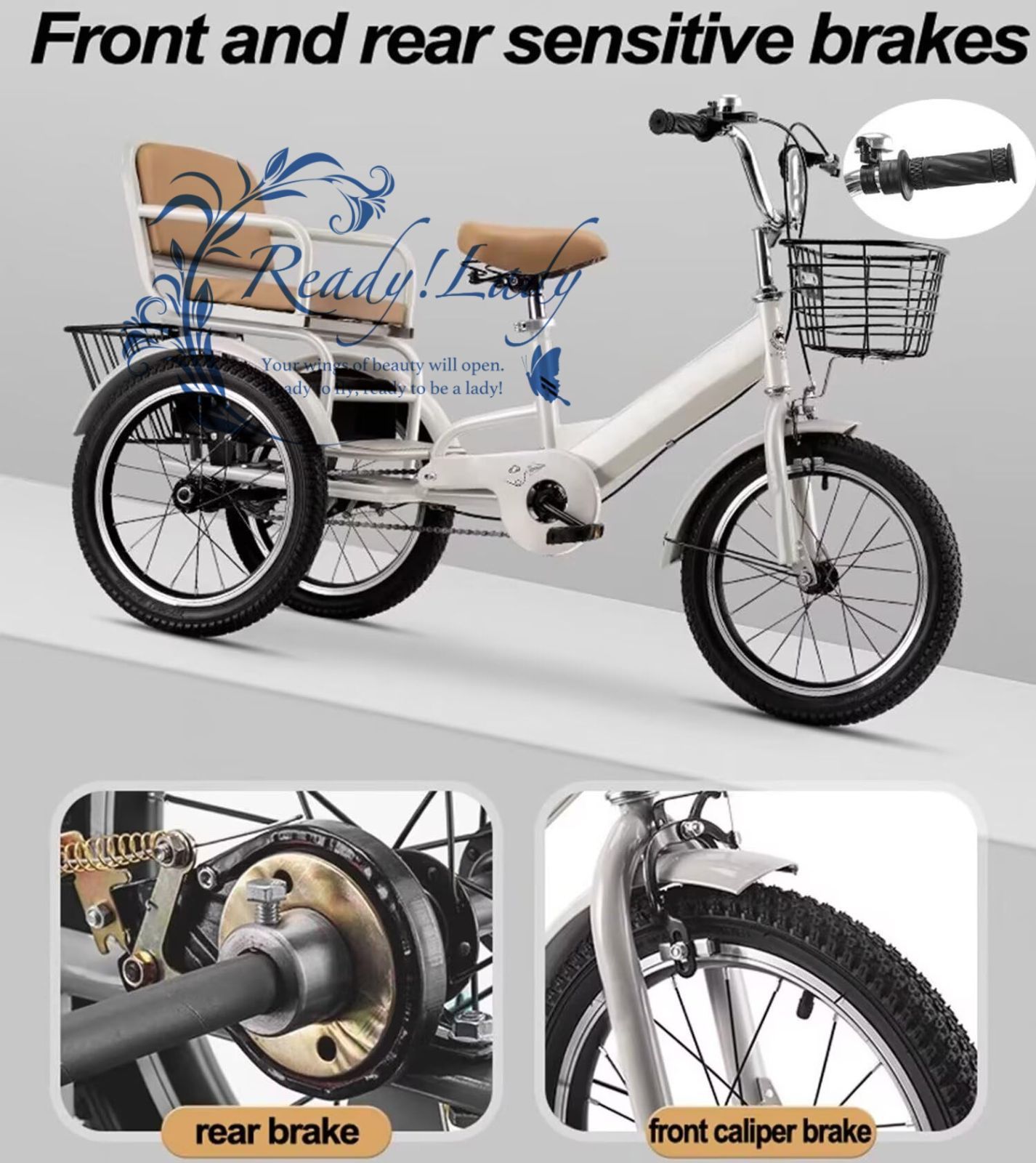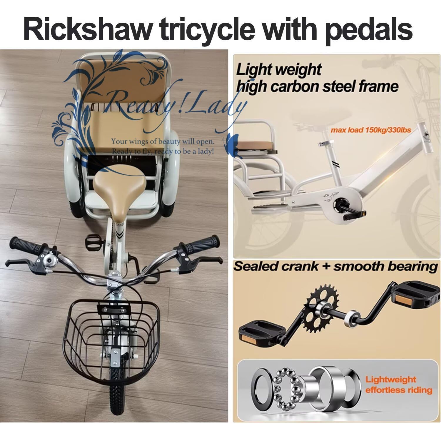3輪自転車人力車三輪車、ペダル付き、タンデム三輪車後部座席、安全ベルトとアームレスト、屋外クルージング用前輪後輪ブレーキ 18寸