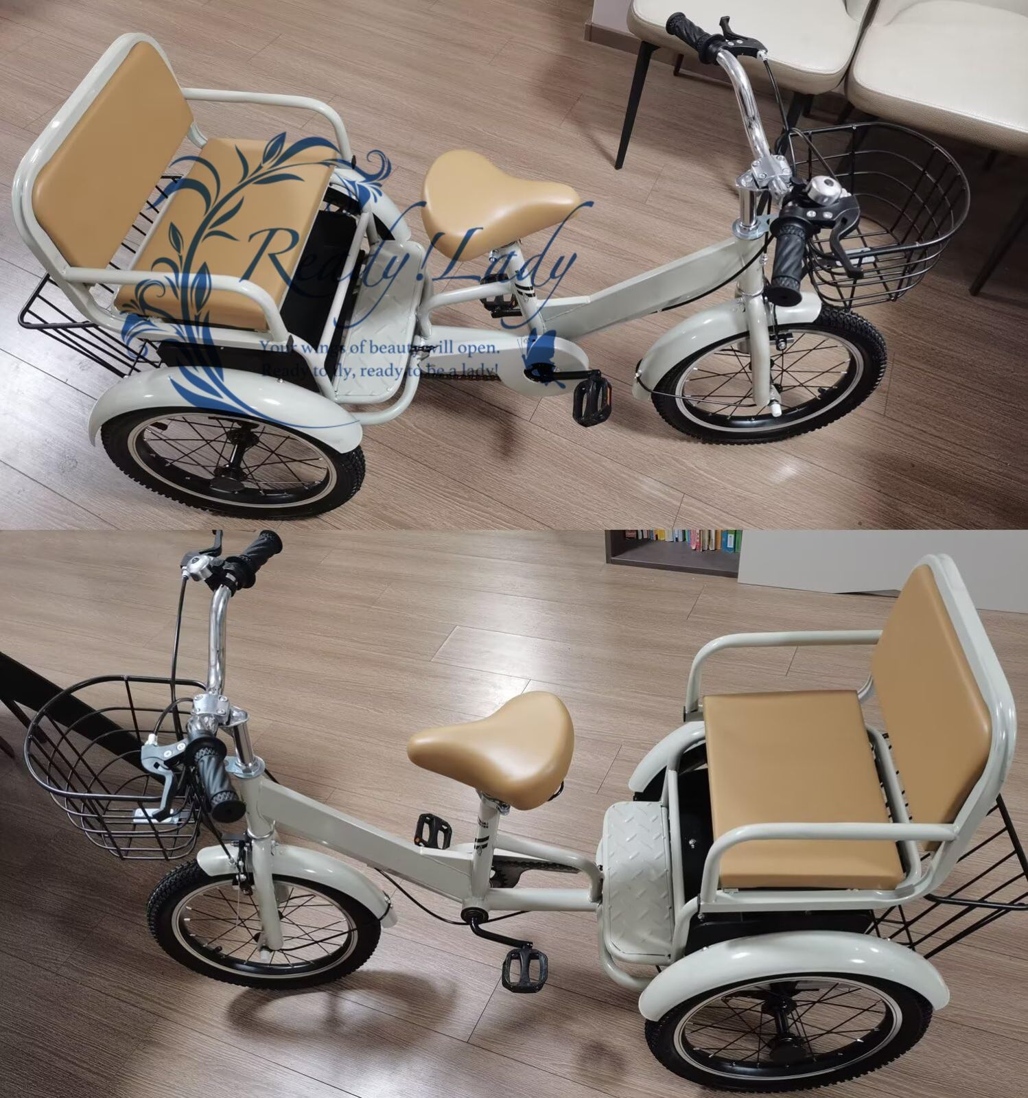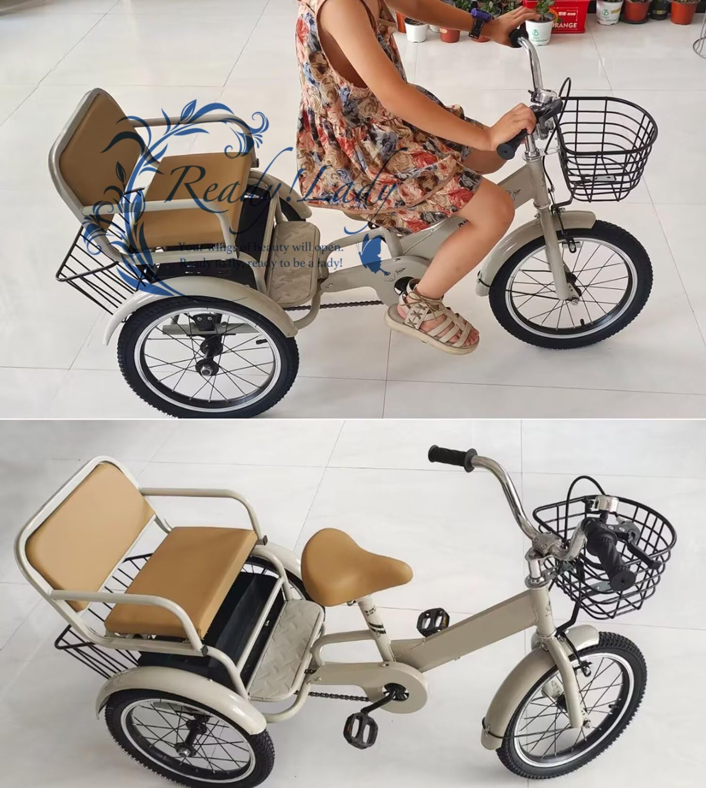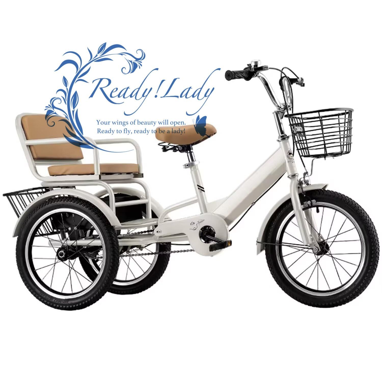 3輪自転車人力車三輪車、ペダル付き、タンデム三輪車後部座席、安全ベルトとアームレスト、屋外クルージング用前輪後輪ブレーキ 18寸