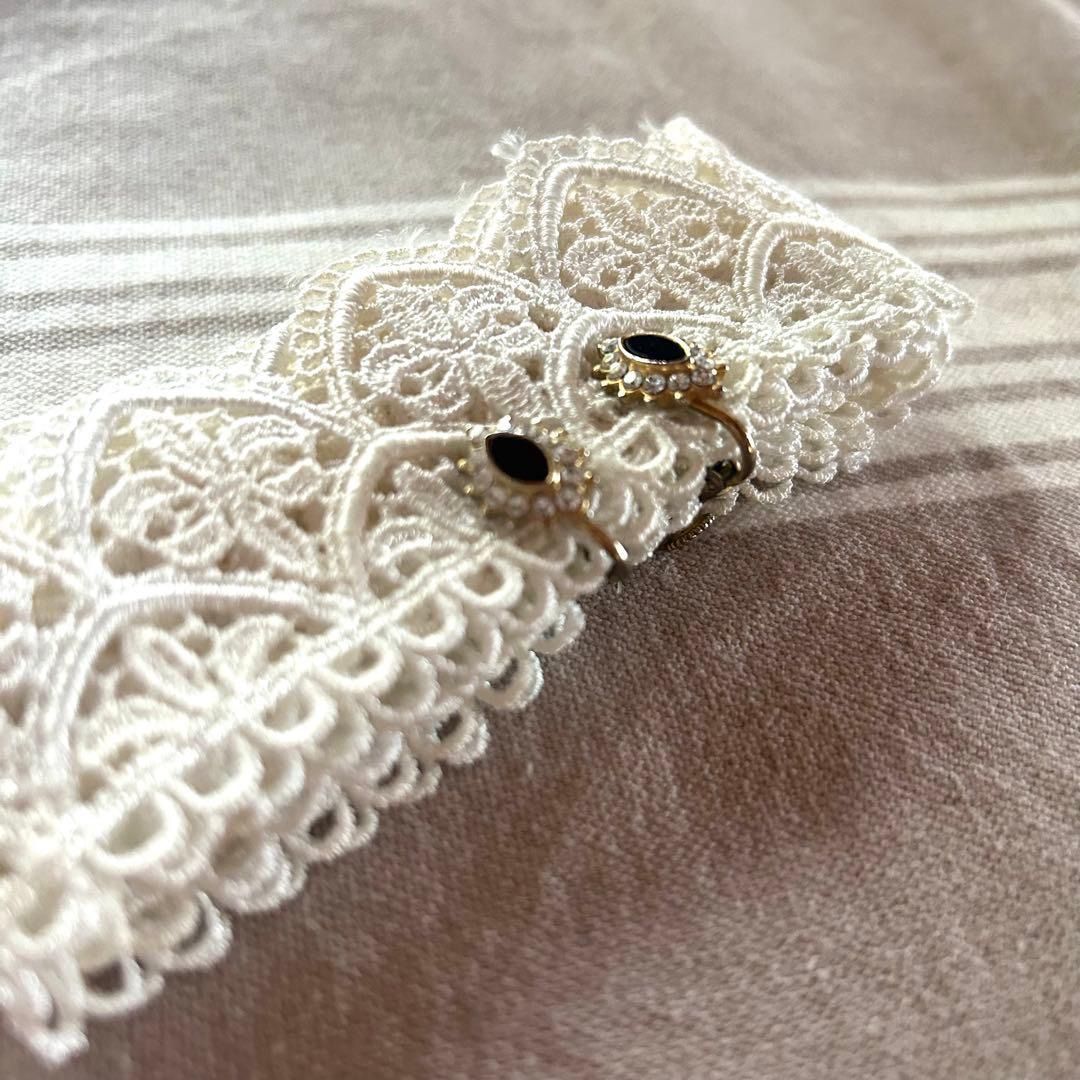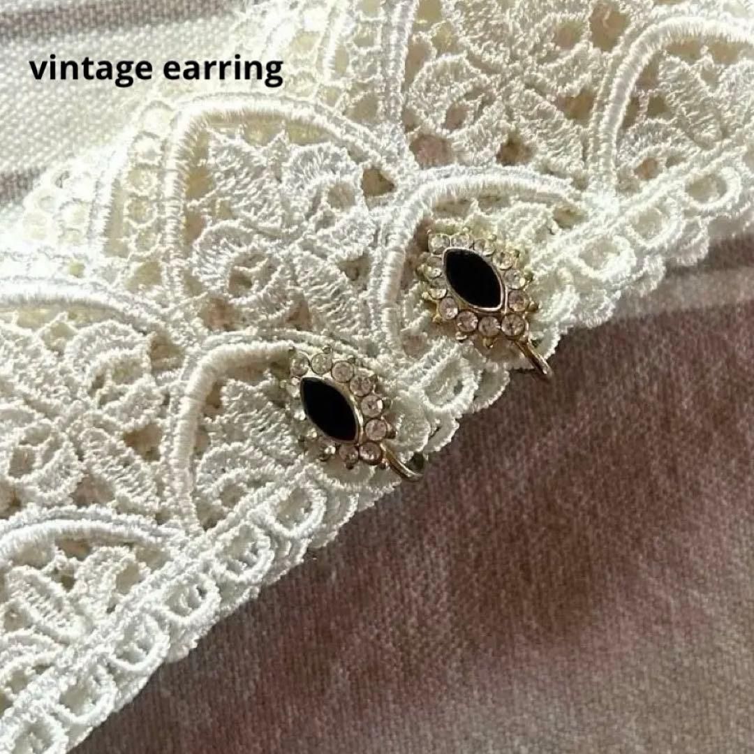 黒のアーモンド型の周りをクリアのビジューが囲んで華やかな雰囲気のビンテージイヤリングです。角度によって煌めきが変わり表情のあるアイテム