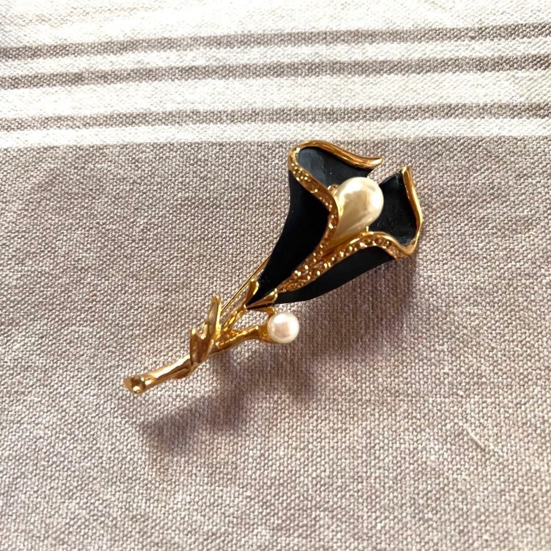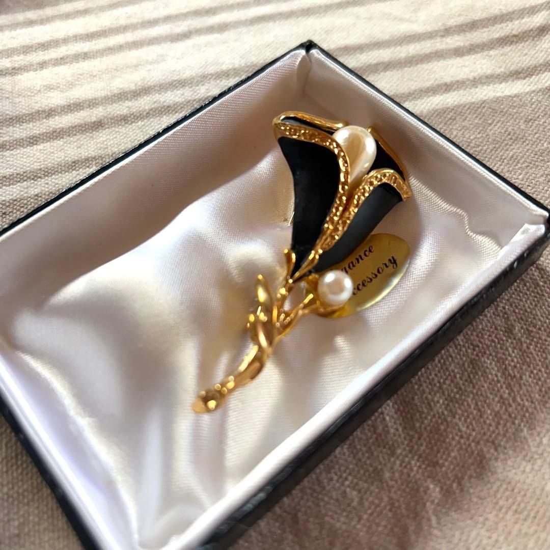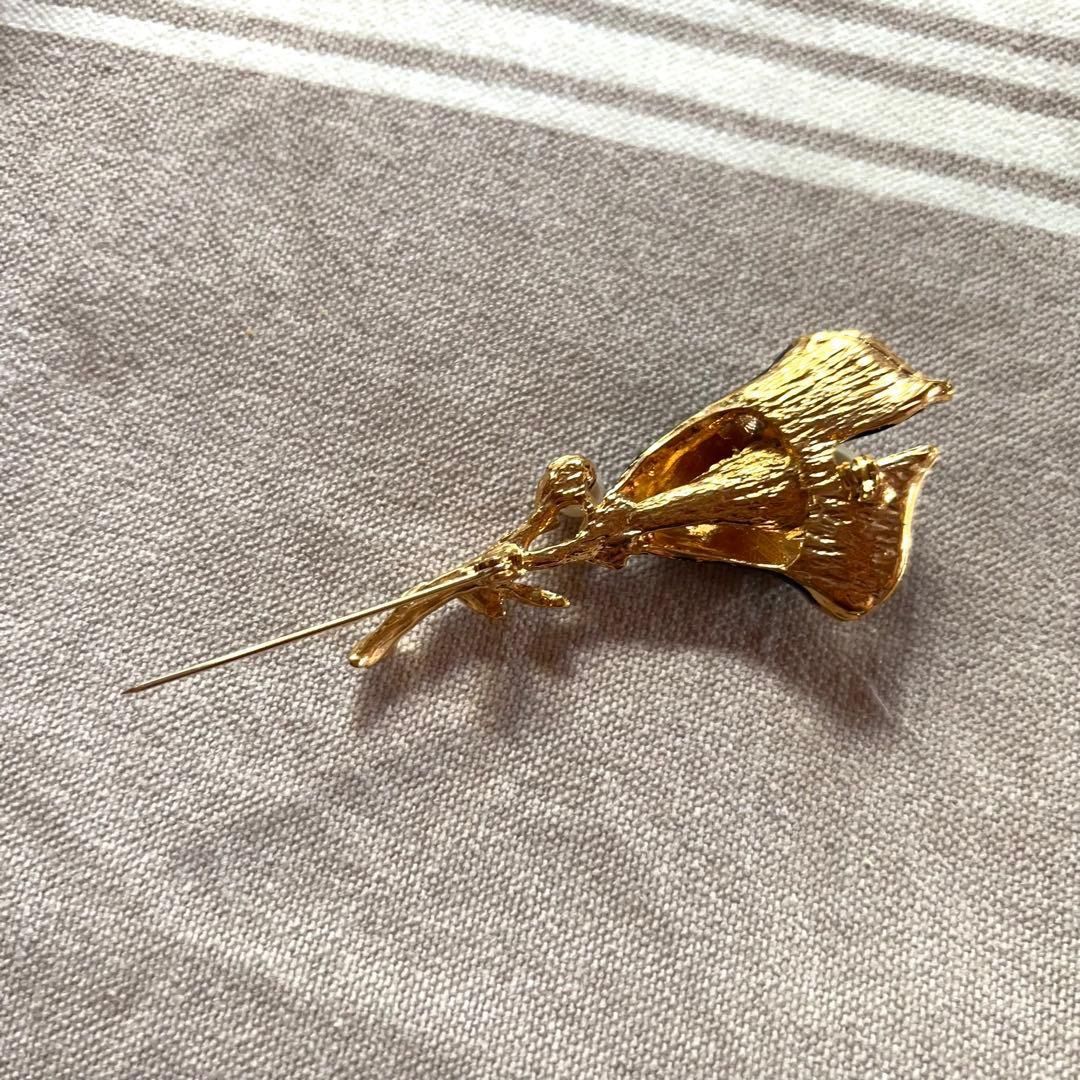カラーのお花のようなデザインにパールを包んだビンテージブローチです。ゴールドがアクセントになって華やかな雰囲気のあるアイテム