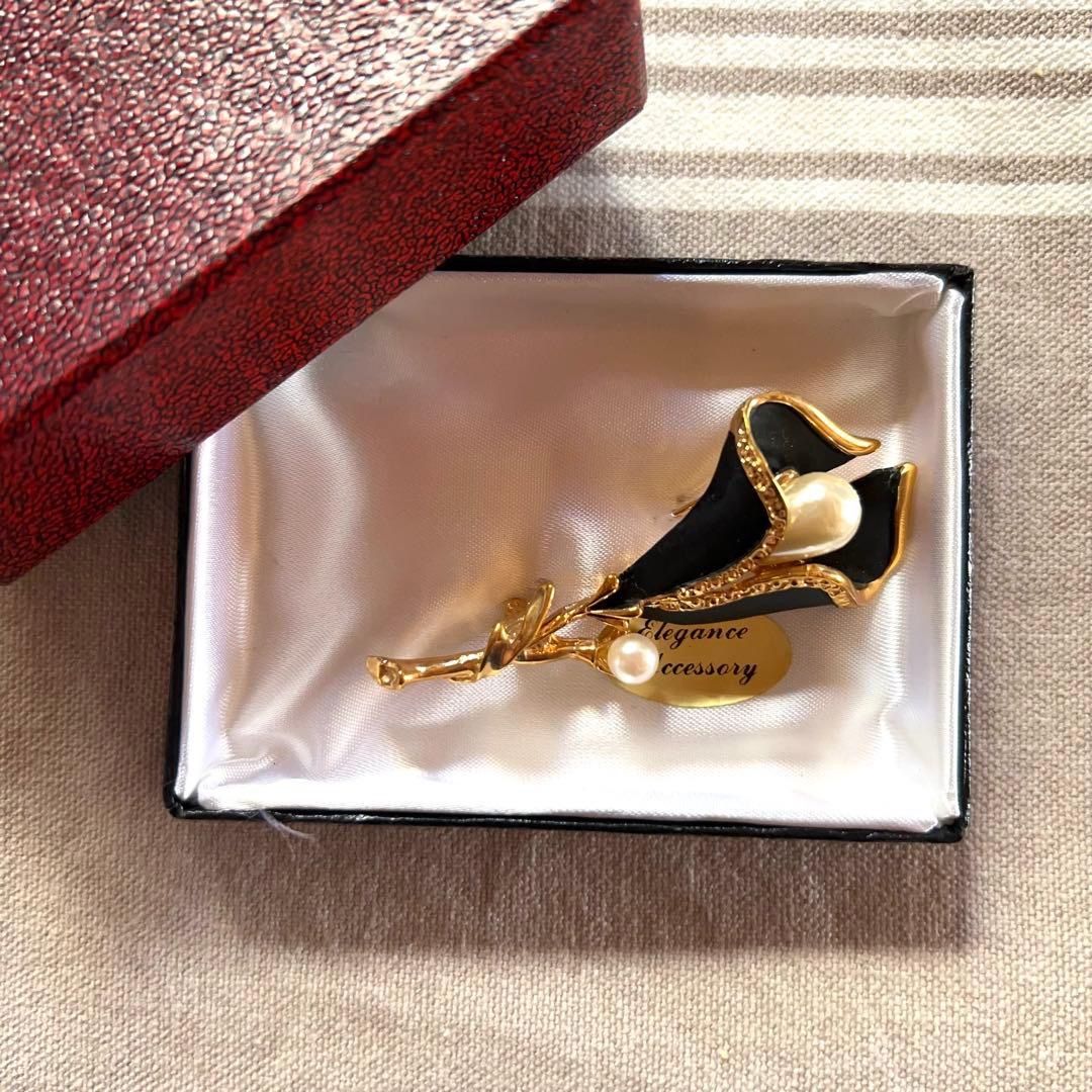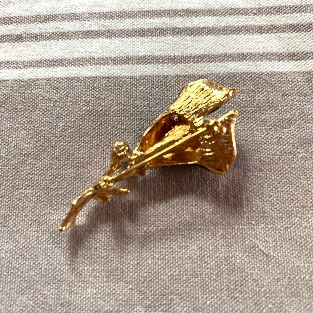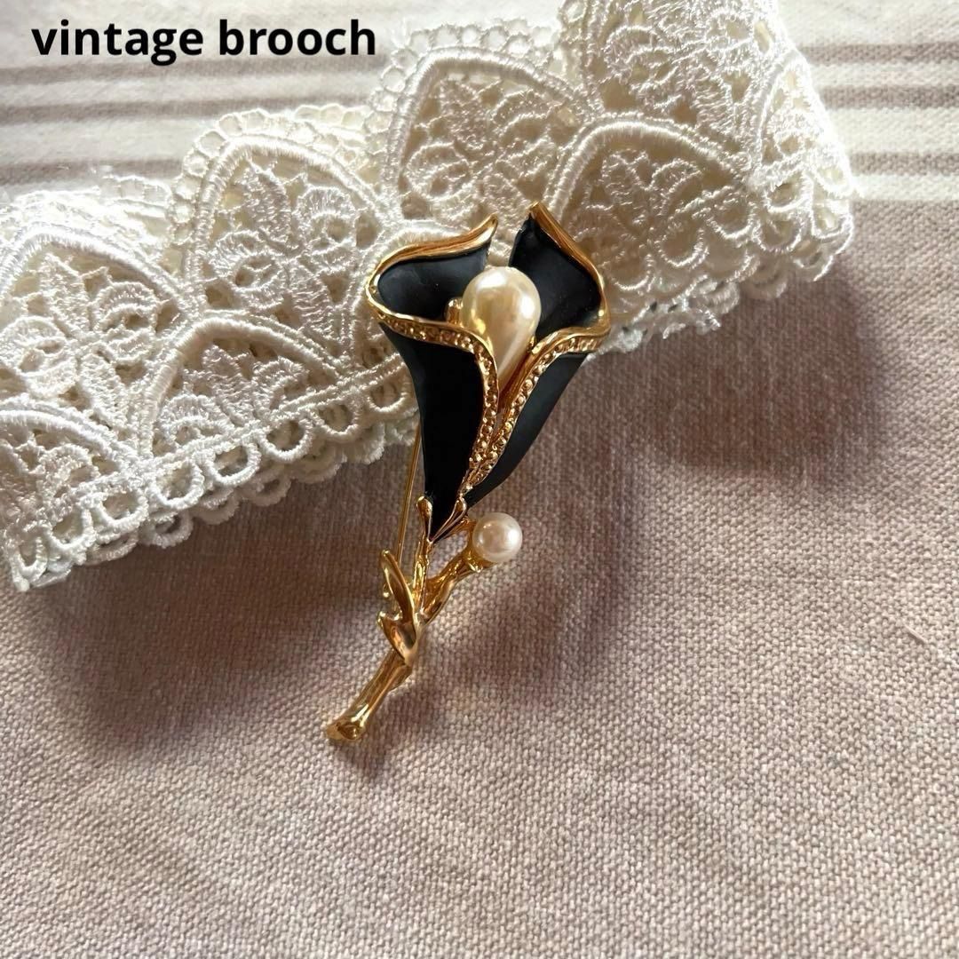 カラーのお花のようなデザインにパールを包んだビンテージブローチです。ゴールドがアクセントになって華やかな雰囲気のあるアイテム